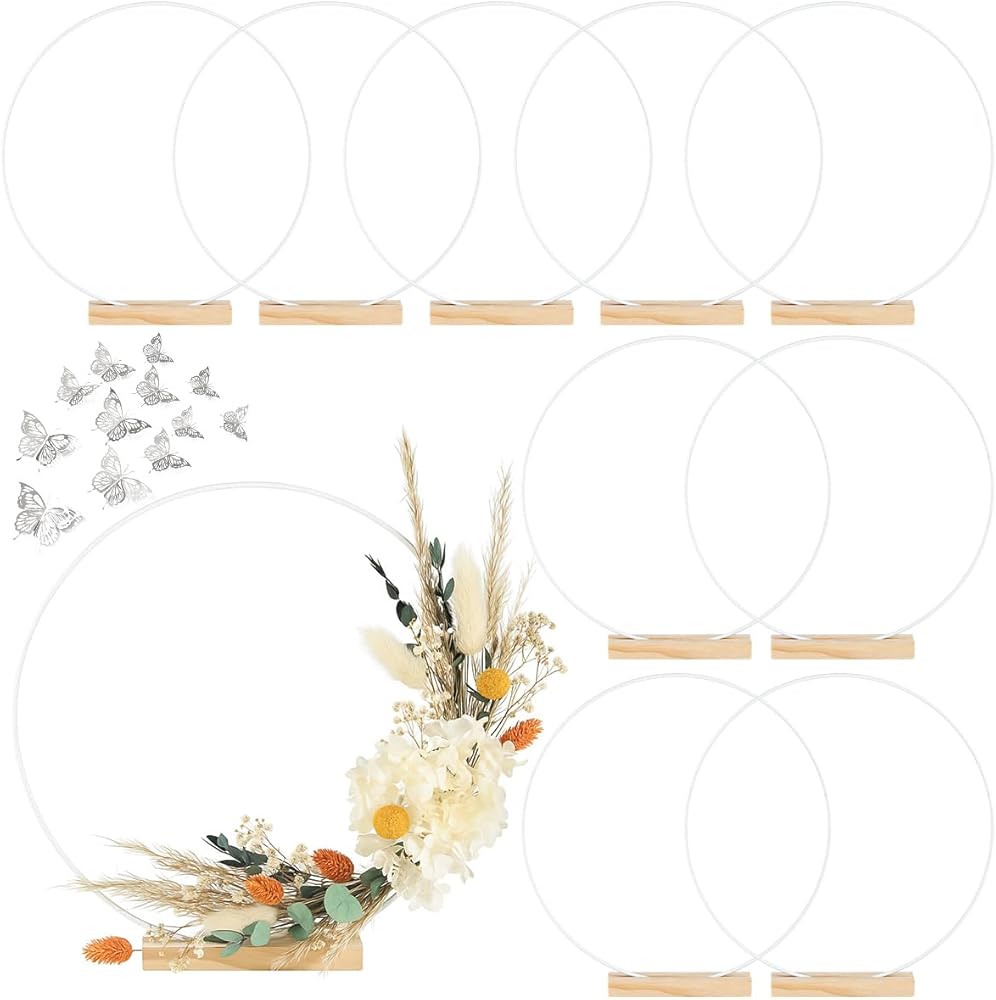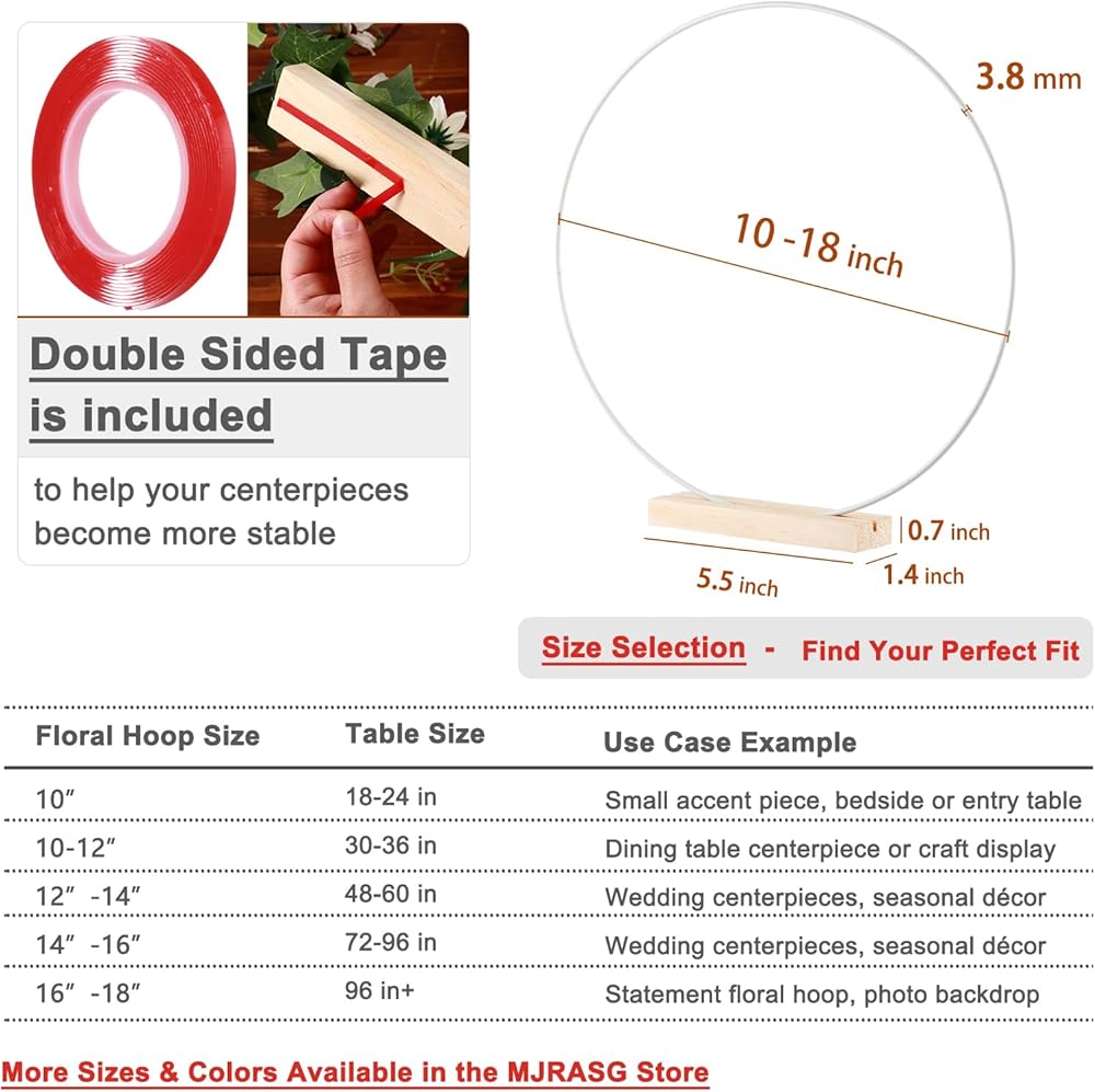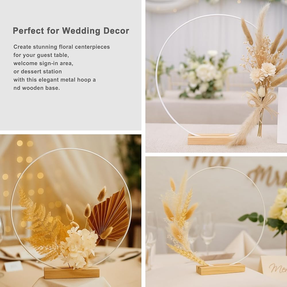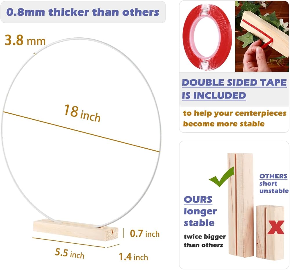 10 PCS Set: The package comes with 10-pack metal hoops for crafts, 10 pcs of wooden centerpiece stands, 1 pack double side tape and 38 yards of paddle wire. Great combo for making any amazing metal floral hoop centerpiece.