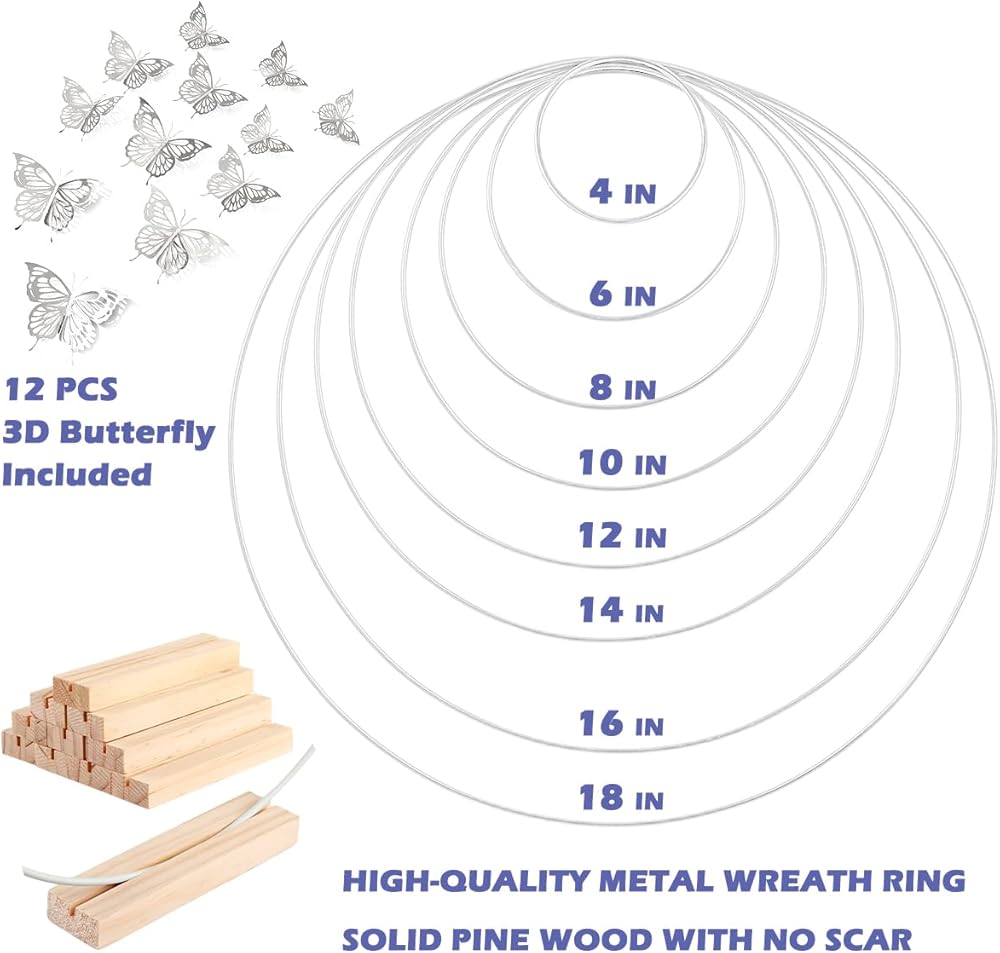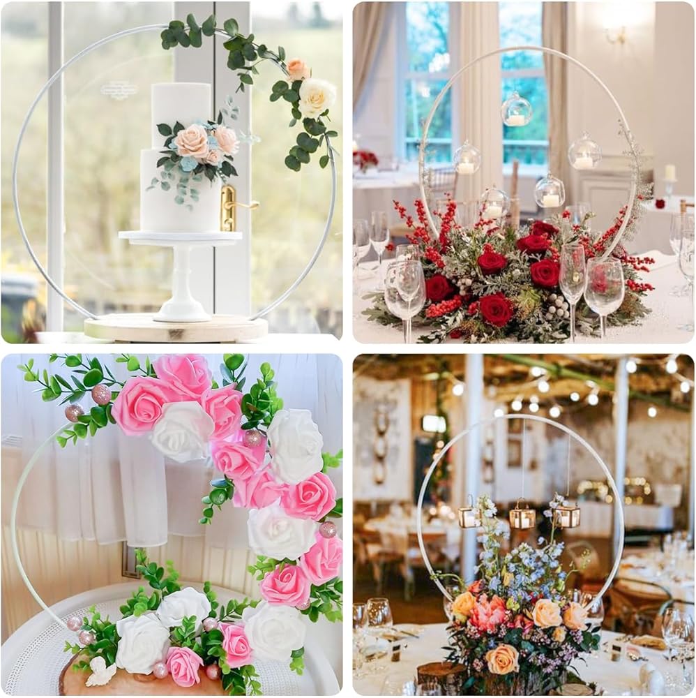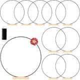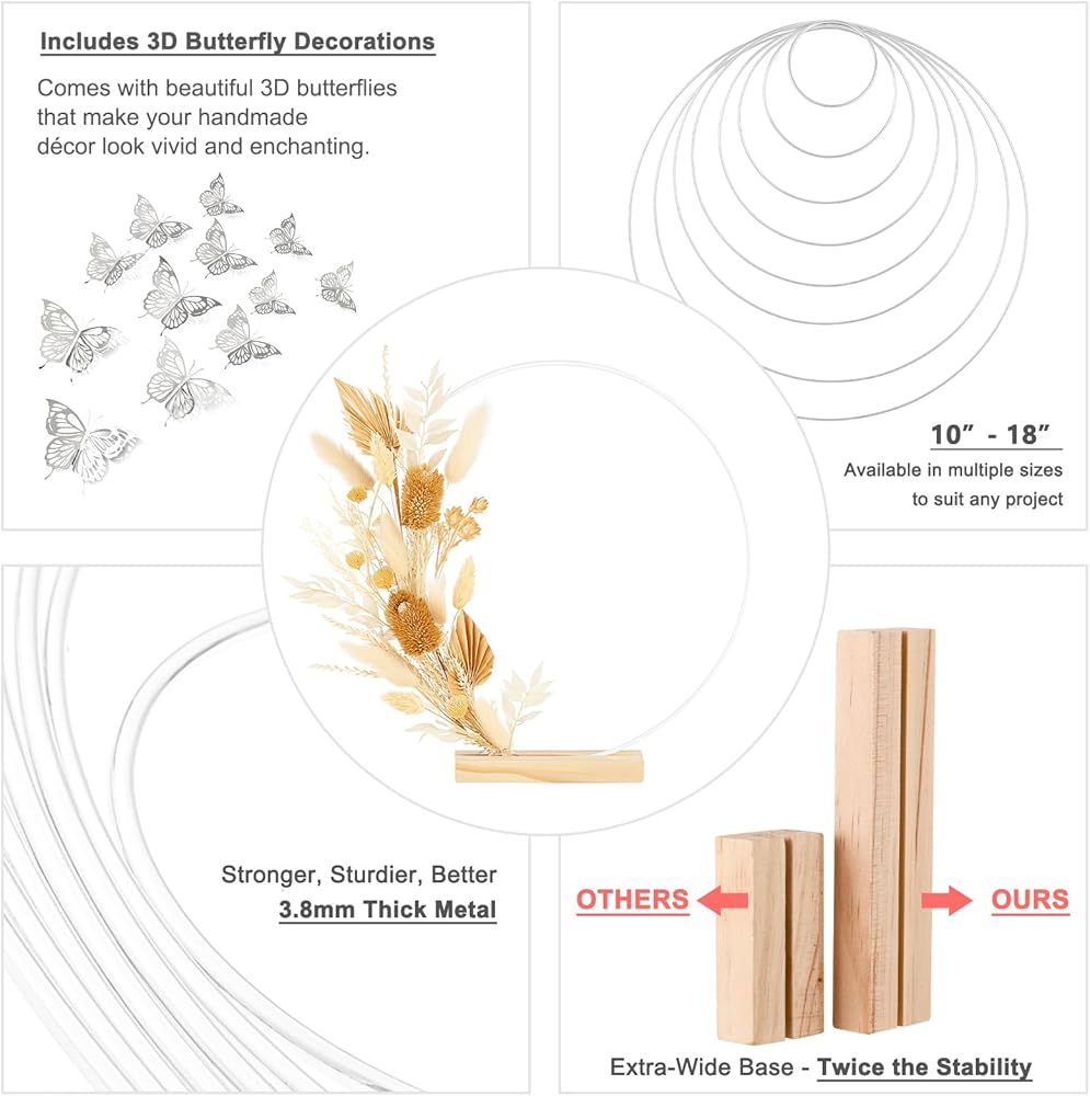 10 PCS Set: The package comes with 10-pack metal hoops for crafts, 10 pcs of wooden centerpiece stands, 1 pack double side tape and 38 yards of paddle wire. Great combo for making any amazing metal floral hoop centerpiece.