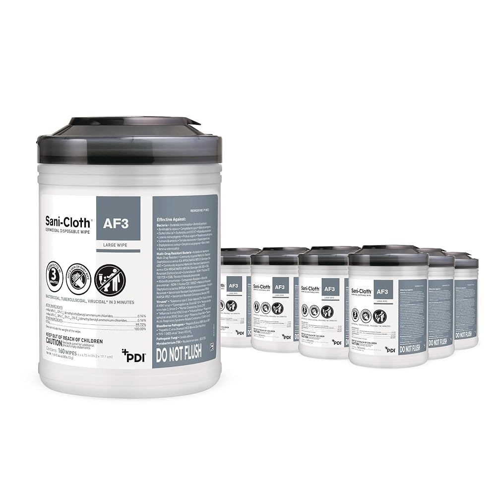 Sani-cloth af3 is a non-woven, disposable cloth, pre-saturated with a quaternary disinfectant cleaner. Recommended for use in hospitals and critical care areas where treated surfaces is of prime importance. Use on hard, nonporous surfaces and equipment. Disinfects in just 3 minutes. Meets cdc, osha and cms tag f441 guidelines. Wipe size: 6" w x 6-3/4"l . 160 wipes per tub. Case of 12 tubs (1,920 wipes total.)