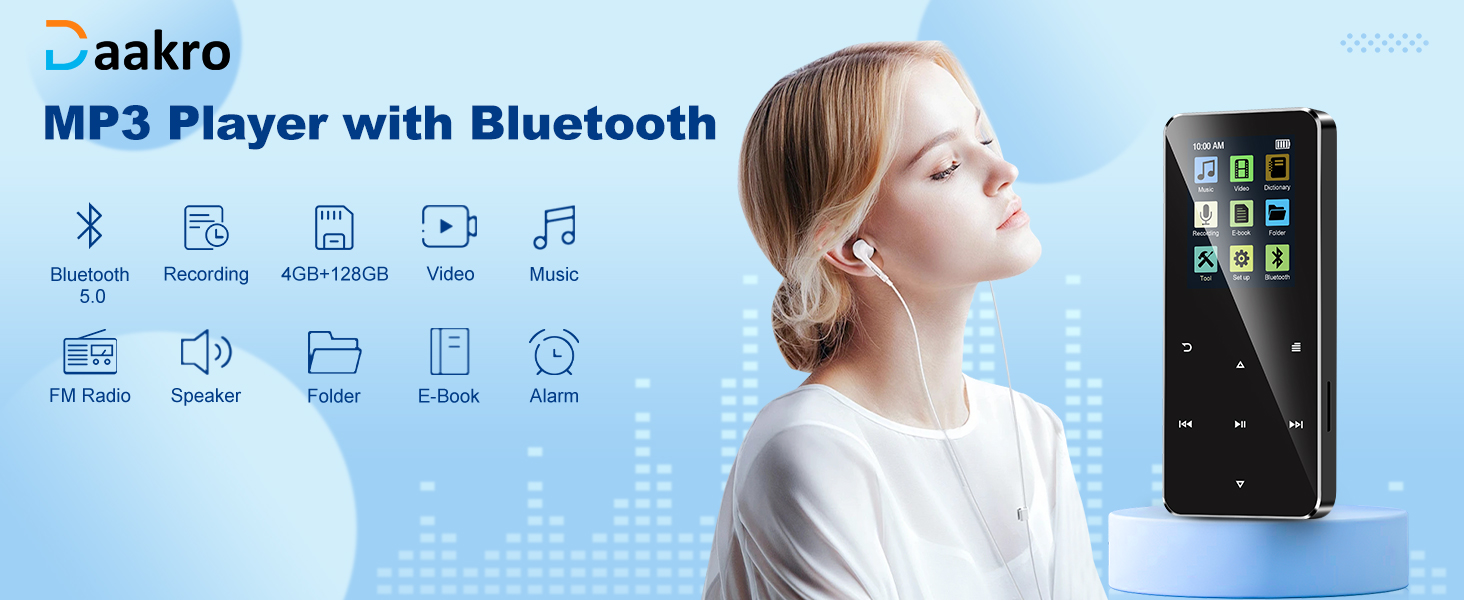 128GB MP3 Player,Daakro Music Player with Bluetooth 5.0 Shuffle, Single Loop, FM Radio, Built-in HD Speaker, Voice Recorder, HiFi Sound,Portable MP3 Player Ideal for Sport, Earphones Included