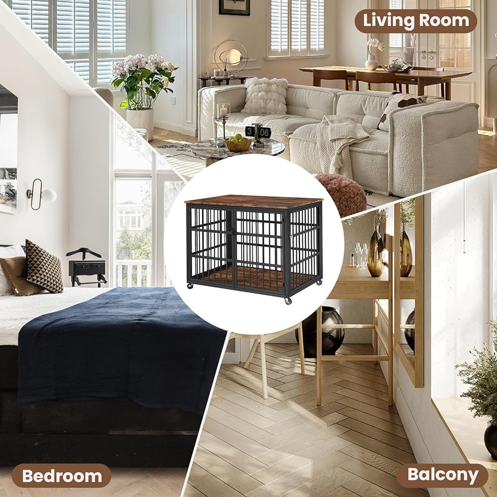 Rovibek Dog Crates for Large Dogs Medium Dogs, Dog Kennel Furniture, High Anxiety Dog Kennel, 43.3", Large Dog Crate, 2 Doors with Side Openings, 4 Wheels, Dog Kennel Indoor, Brown