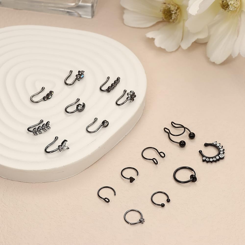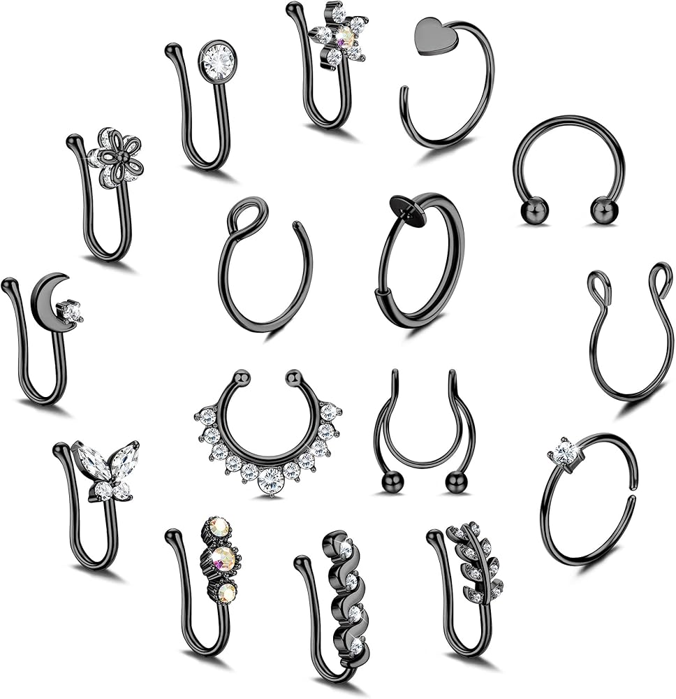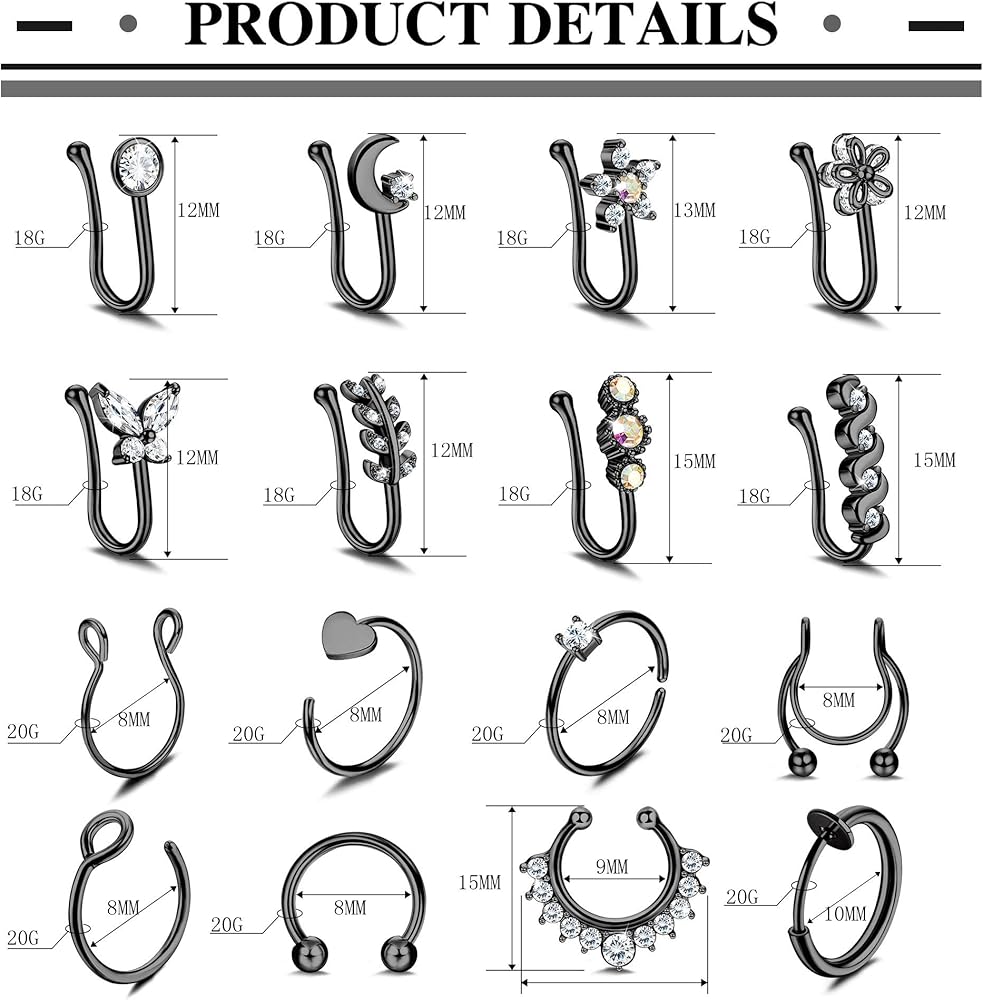 💝DETAILS💝FAKE NOSE RINS 16Pcs a set,they are all about the same size: FAKE SEPTUM RINGS = 1.2MM or 0.8MM(16G or 20G); FAKE NOSE HOOP = 10MM or 8mm(16G or 20G);NOSE CUFF = 8MM*13MM, specific information is shown in the figure on the left.