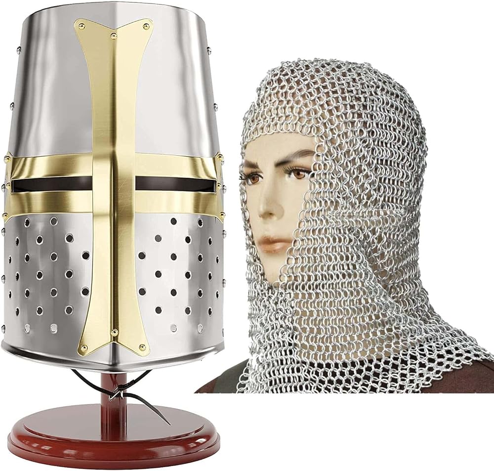 ⚔️★ 1 METAL CRUSADERS HELMET WITH FITTED LEATHER LINER:- Our Metal Crusades Helmets comes with Fitted Flux Leather Liner & Adustable Chinstrap which provide Great Comfort to our Crusaders Knights in Larp Re-enactment Renaissance Party and Cosplay. Part of Holy Knight Costume.