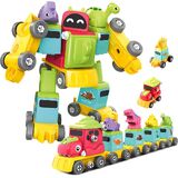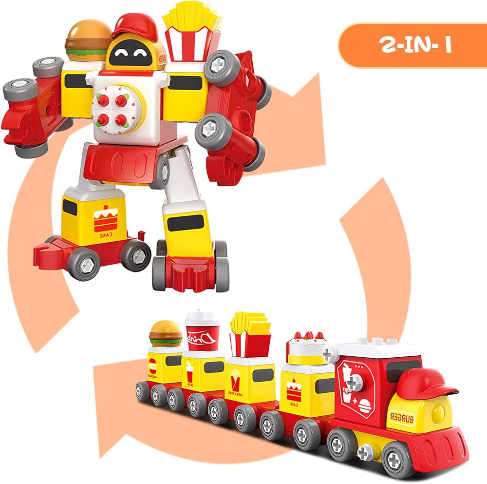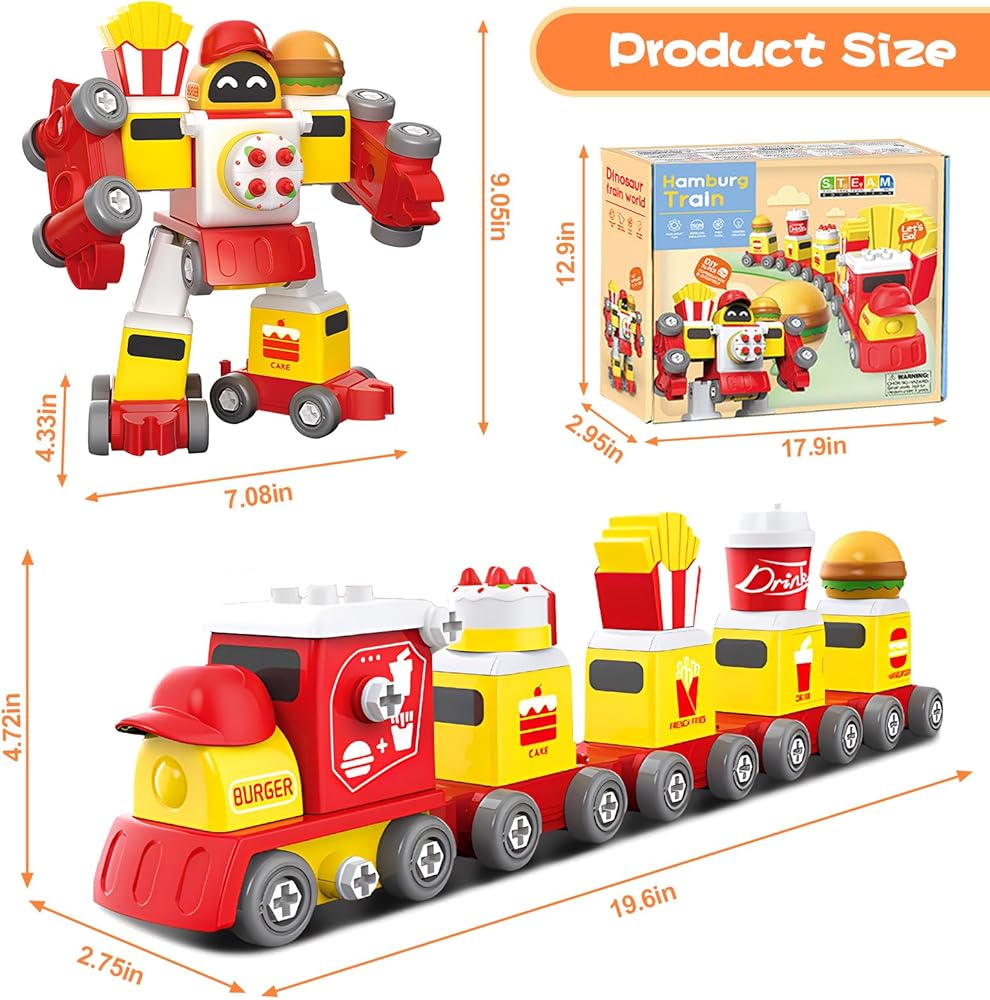 THREE WAYS TO PLAY - Toddler toys come in three forms, kids can combine the components to form 5 separate cars toys, the wheels of car toys can be rolled. Kids can also connecting 5 car toys together to form a train set, or use screws to assemble the components into a large burger robot toy.give your kids an afternoon of fun (Trains size: 50*11*6cm, robot size: 21*18*11cm)