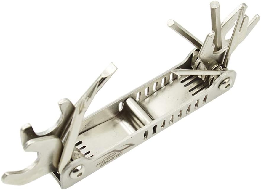 13 in 1: 5/32 wrench, 3/16 wrench, small Phillips screwdriver, small slotted screwdriver, 9/16" wrench, 13/16" wrench,