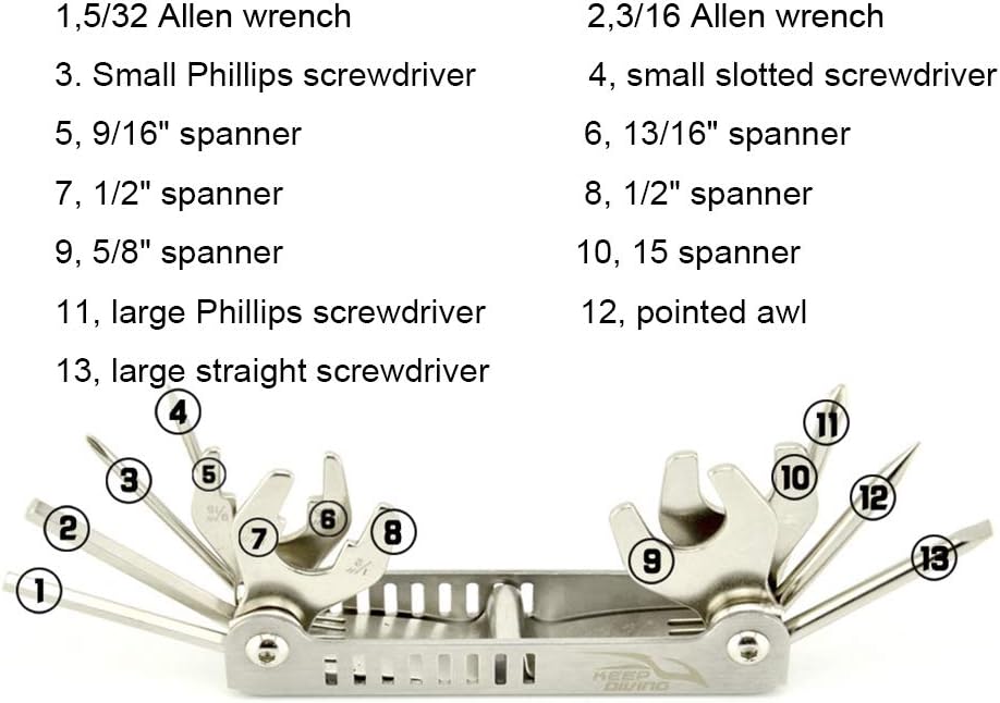 13 in 1 diving maintenance and repair multi tool, Can be used to adjust and repair REG diving equipment.