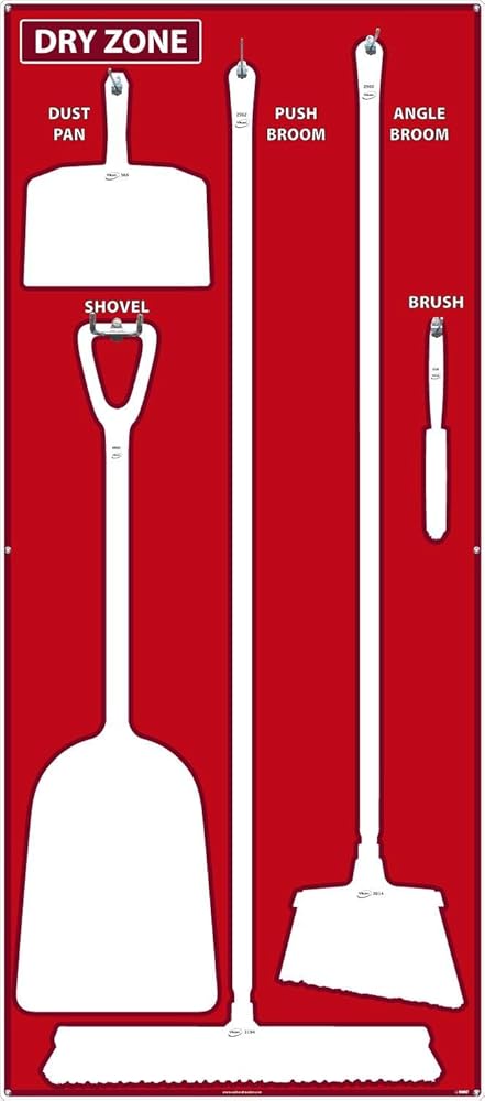 Many manufacturing and food processing facilities are implementing 5S Shadow Boards to help reduce cost and down time by keeping cleaning supplies (and other tools), in a central location, neatly stored, and always accessible. Great for industrial, manufacturing applications. Includes Shadow Board and hardware for mounting tools Designed for Vikan brand tools (sold separately): 12” Angle broom, 24” Push Broom with 59” Handle, Dust pan, Bench brush, Single piece shovel with 14” blade. Durable, industrial grade aluminum. Protected by Sign Muscle liquid laminate Temperature range of -40° to 250°.
