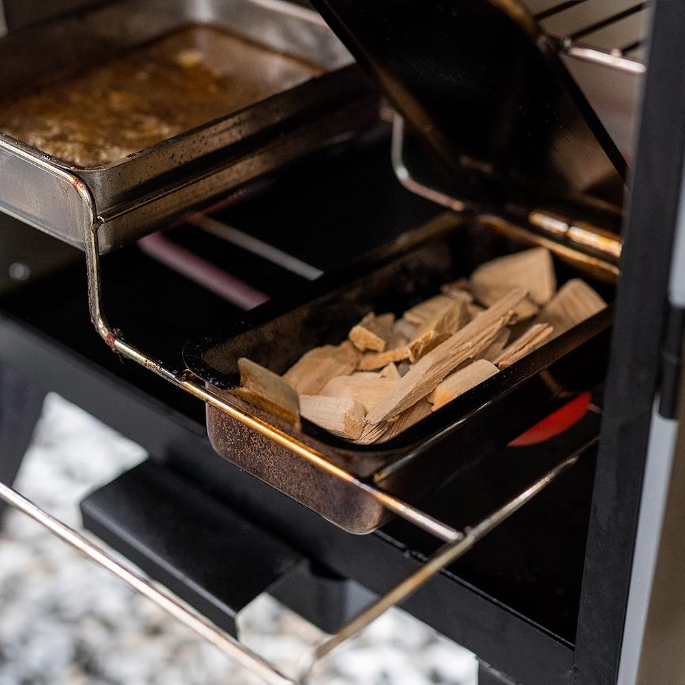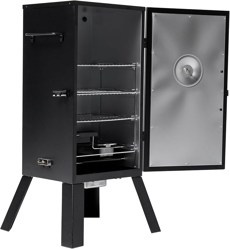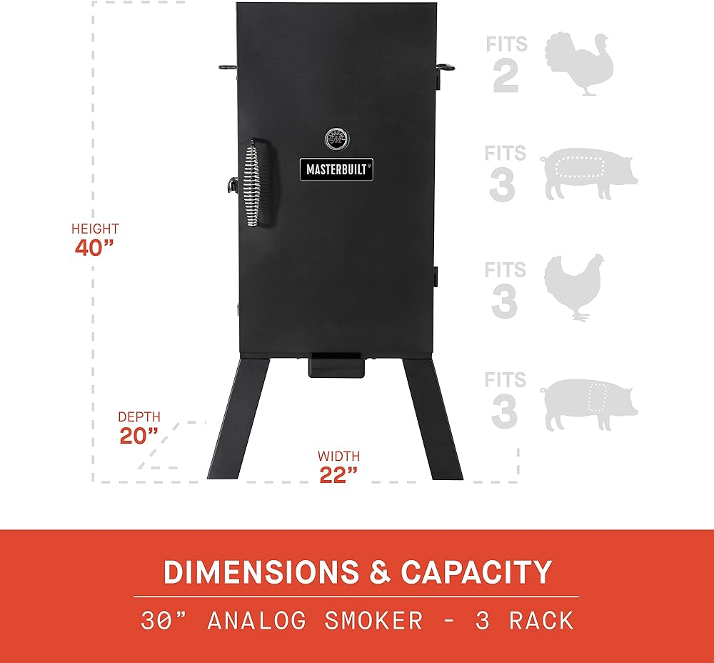 With the Masterbuilt Analog Electric Smoker, you'll achieve competition-ready results in your own backyard, without the hassle of charcoal or propane. Simply plug this smoker in, set the analog controls, & it does the work! Get even, consistent smoking with the built-in temperature Gauge & thermostat temperature control. The two chrome-coated racks provide plenty of room to smokeup to 4 chickens, 2 turkeys, 2 racks or ribs, or 2 pork butts. Master the art of smoking with Masterbuilt.