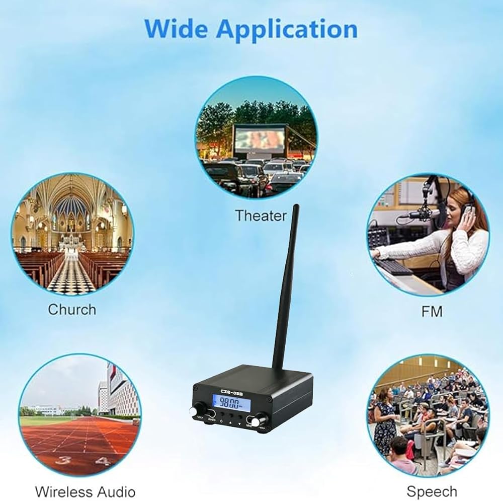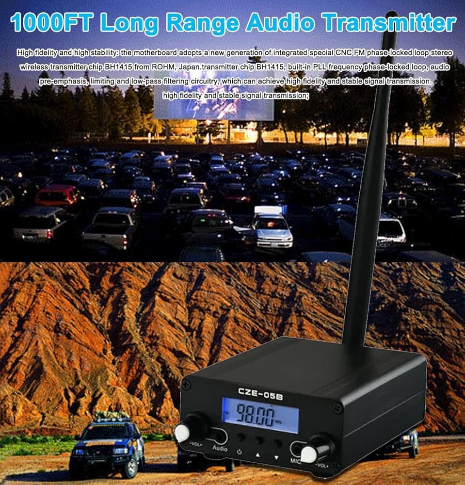 جهاز إرسال FM للكنيسة، جهاز إرسال راديو FM، محطة راديو صغيرة ستيريو FM طويلة المدى مع مقبس صوت ميكروفون 3.5 مم لفيلم القيادة، موقف سيارات الكنيسة، أضواء عرض الألعاب النارية