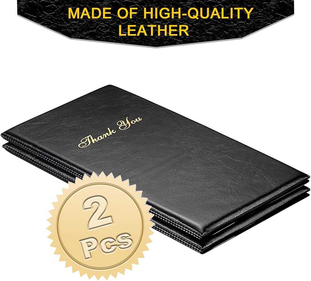Black Vinyl Guest Check 11mm Thick, 2 Interior Pockets, and 1 Credit Card Holder for Safe Storage of Cash, Bills, or , Clear Card Pocket to Display Guest Cards, Gift Cards and Credit Cards Can Be Slid in and out easily and freely. Pre-printed with 'Thank You' in gold leaf on the front, a great way to communicate with your guests and end table service.