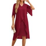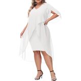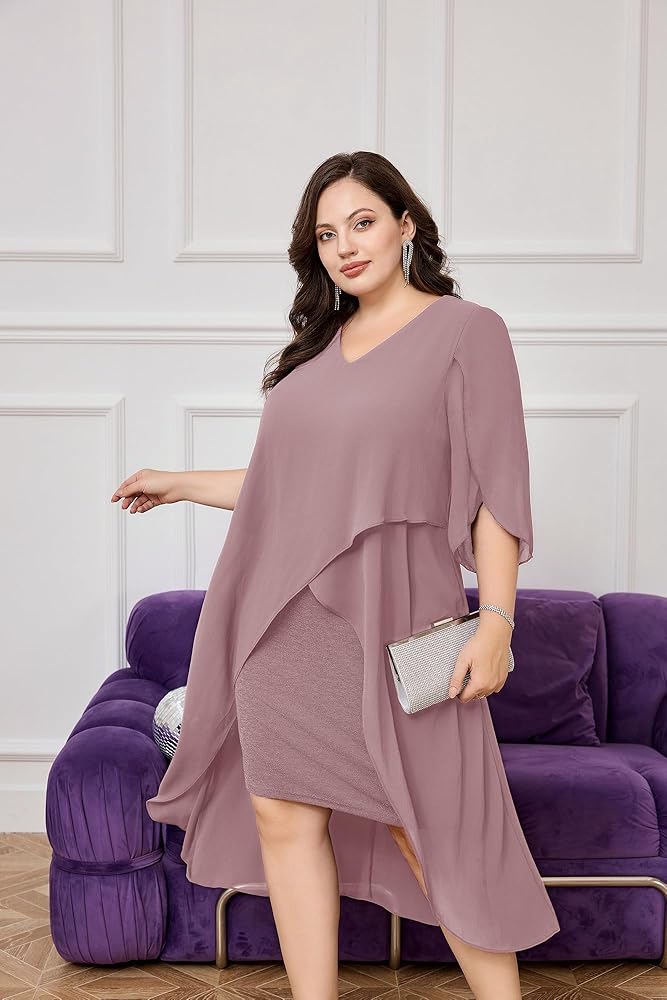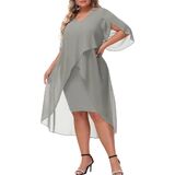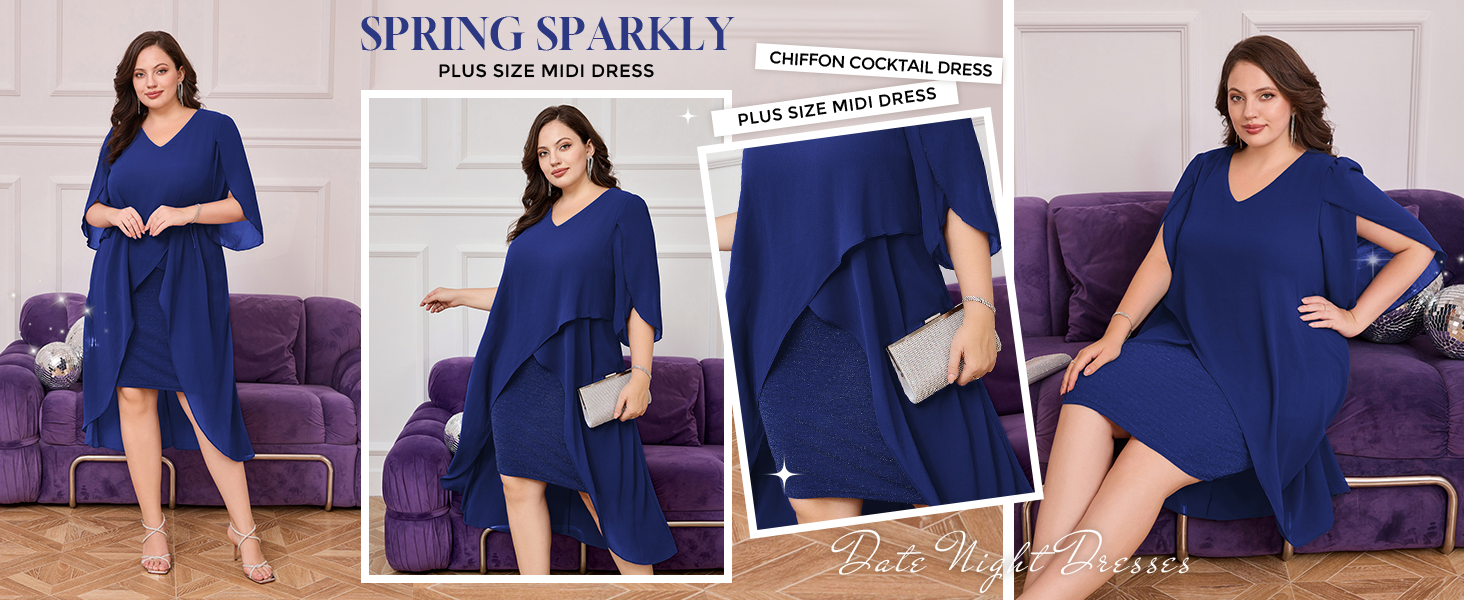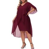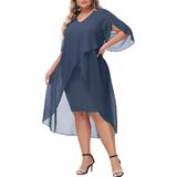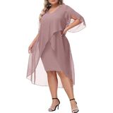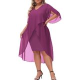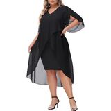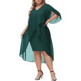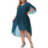 Plus Size Cocktail Dress: Elegent v-neck chiffon dresses has flowy ruffle 3/4 sleeve, soft chiffon overlay brings you flowy asymmetric hem, perfectly accentuates your curves, hiding the imperfection yet still flattering and beautiful.