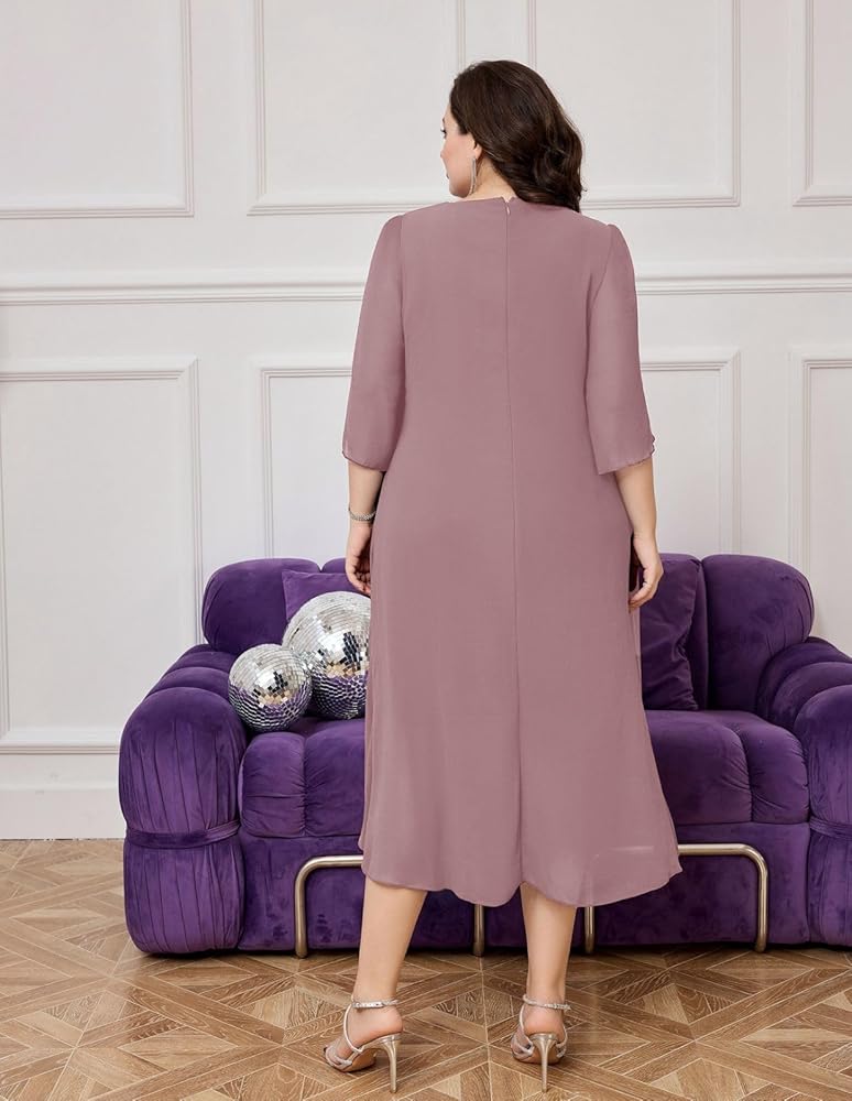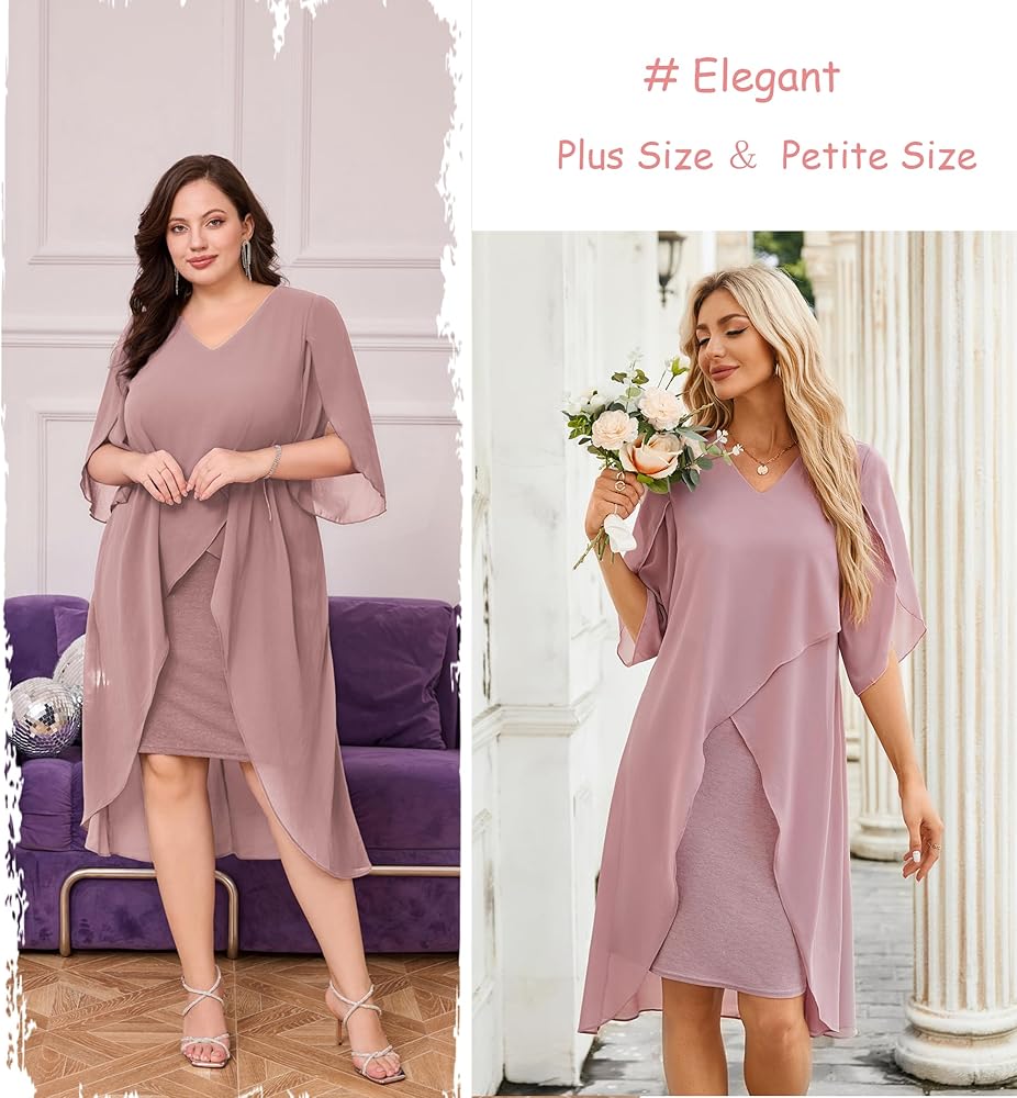 Nice Style: Plus size two piece chiffon dress had slit aside arms on the overlay show great temperament and makes you look stunning in daily life, this plus size flattering midi dress very well decorate your arms and upper body.