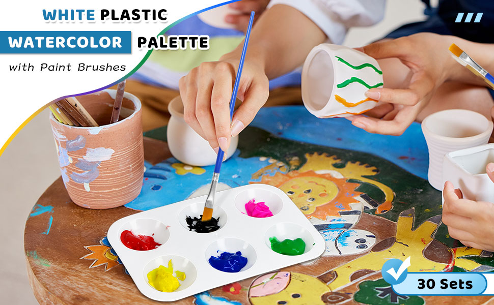 DLOnline 30 Sets White Plastic Watercolor Palette with Paint Brushes, 6 Well Rectangular Paint Palettes, Paint Tray Palettes, Paint Trays for Kids, for Painting, DIY Craft, Art Painting Class