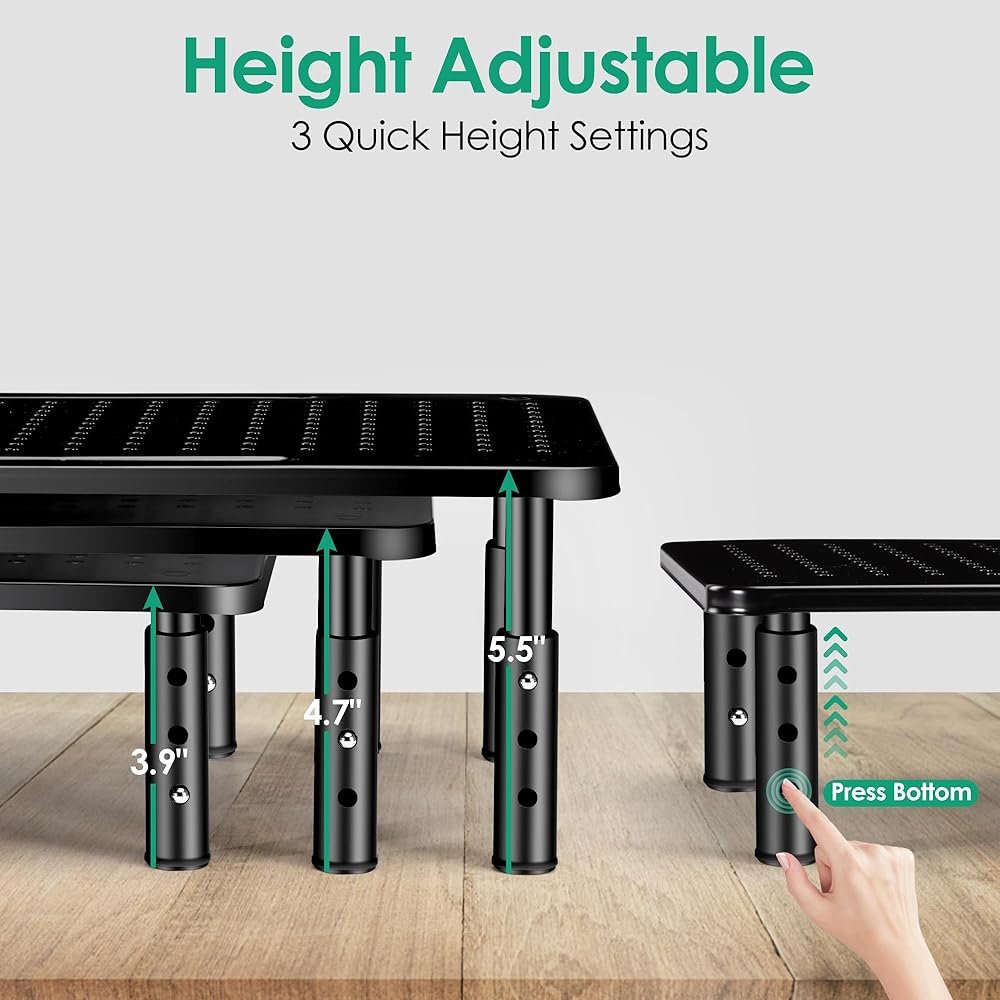 【Ergonomic Height Adjustable】 This monitor stand features an ergonomic design, offering 3 height settings at 3.9 inches, 4.7 inches, and 5.5 inches. Achieve your preferred and comfortable viewing height by simply pressing the buttons on the legs to customize the stand's elevation.