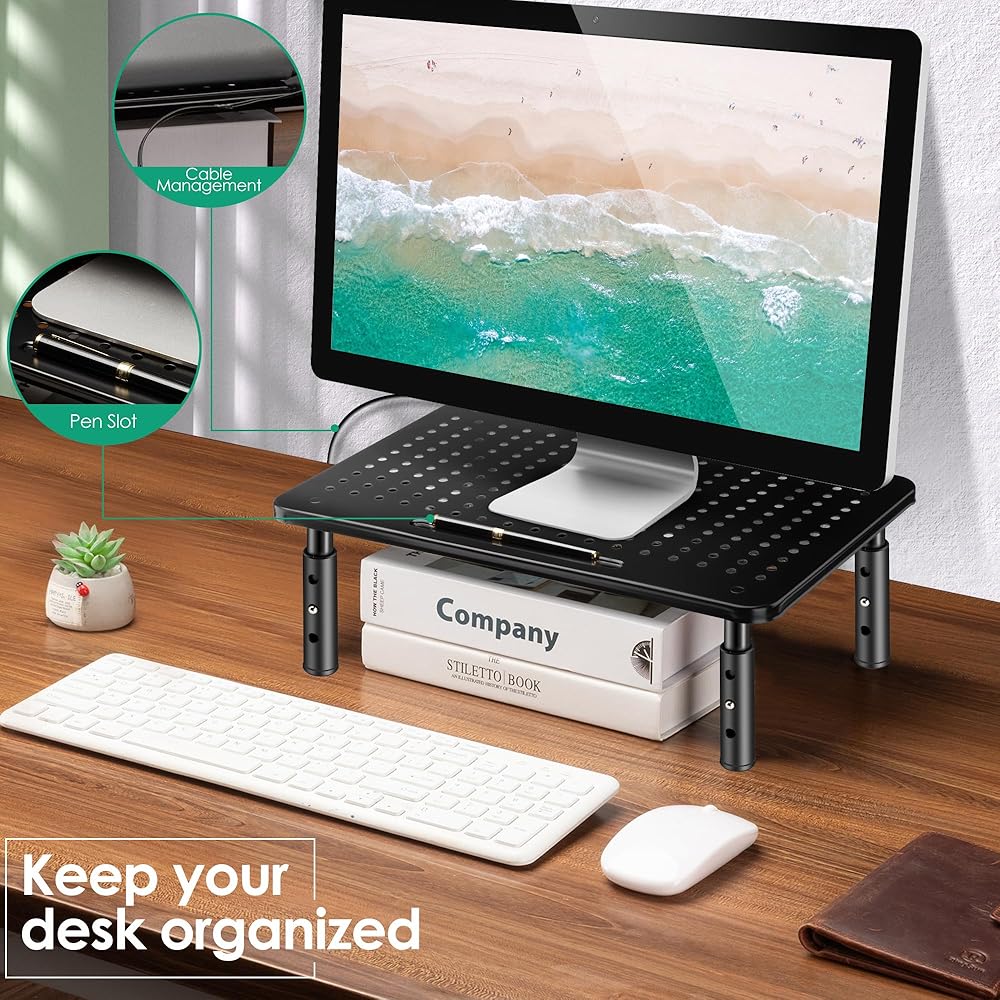 【Efficient Heat Dissipation】Constructed from powder-coated steel, the monitor riser features a ventilated platform specifically engineered for enhanced heat dissipation. This design facilitates optimal cooling for your monitor screens and laptop, preventing overheating.