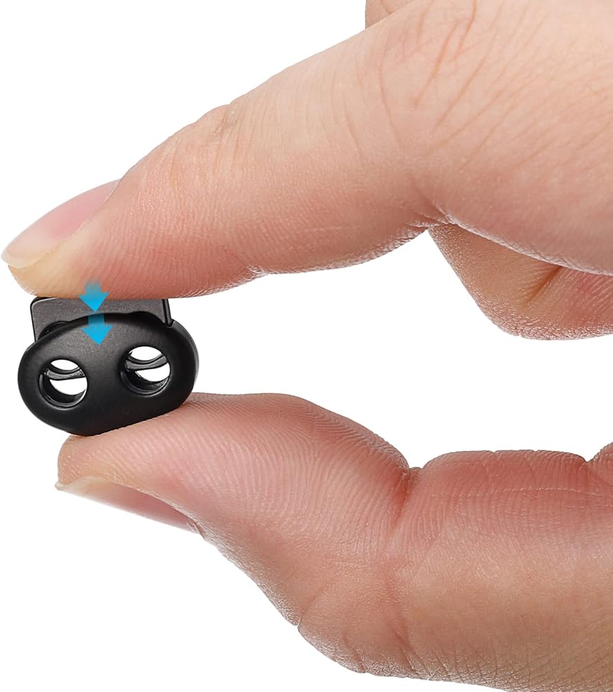 [Easy to Use] - Press the button down and hold it while threading the drawstrings through the holes in the lock, once the drawstrings are through, release the button. The cord lock will keep your drawstrings in place.