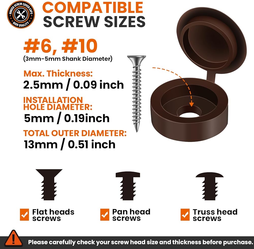 【HINGED SCREW COVER CAPS】 Great for giving a finished look for exposed mounting screws. Apart from its decorative characteristics, this plastic snap cap for screws can protect screws from rust and corrosion, provides durable, attractive coverage for screw and nail holes.
