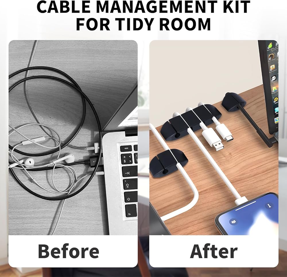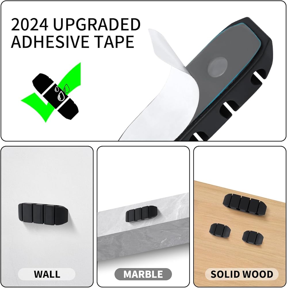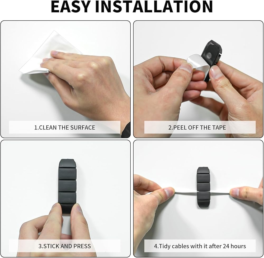 【WIRE ORGANIZER】With this cord organizer kit, you'll never see wires running all over the place and causing a mess everywhere. 【Installation Tips】: Please clean the desired surface without dust before sticking, and keep pressing for 30 seconds to enhance the adhesion of the sticky pad.