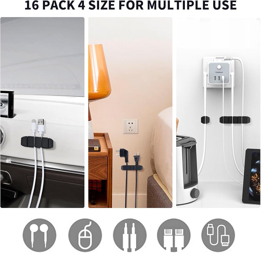 16 Pcs Cable Management Kit Black Cable Clips Holders Multi-Purpose Self-Adhesive Cable Cord Clips Charging USB Wire Organizer for Home Office Car Nightstand Desk