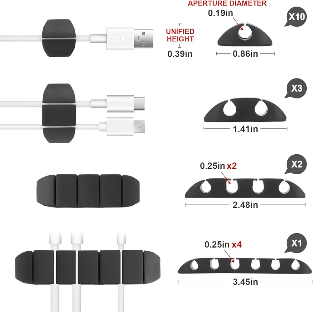 【CABLE MANAGEMENT KIT】: This cable cord management kit comes with 12pcs (1/2/4/6 cord slots) cable clips, which is enough to organize the messy wires. Diameter of 0.19 inches (4.8mm) can hold most cables.