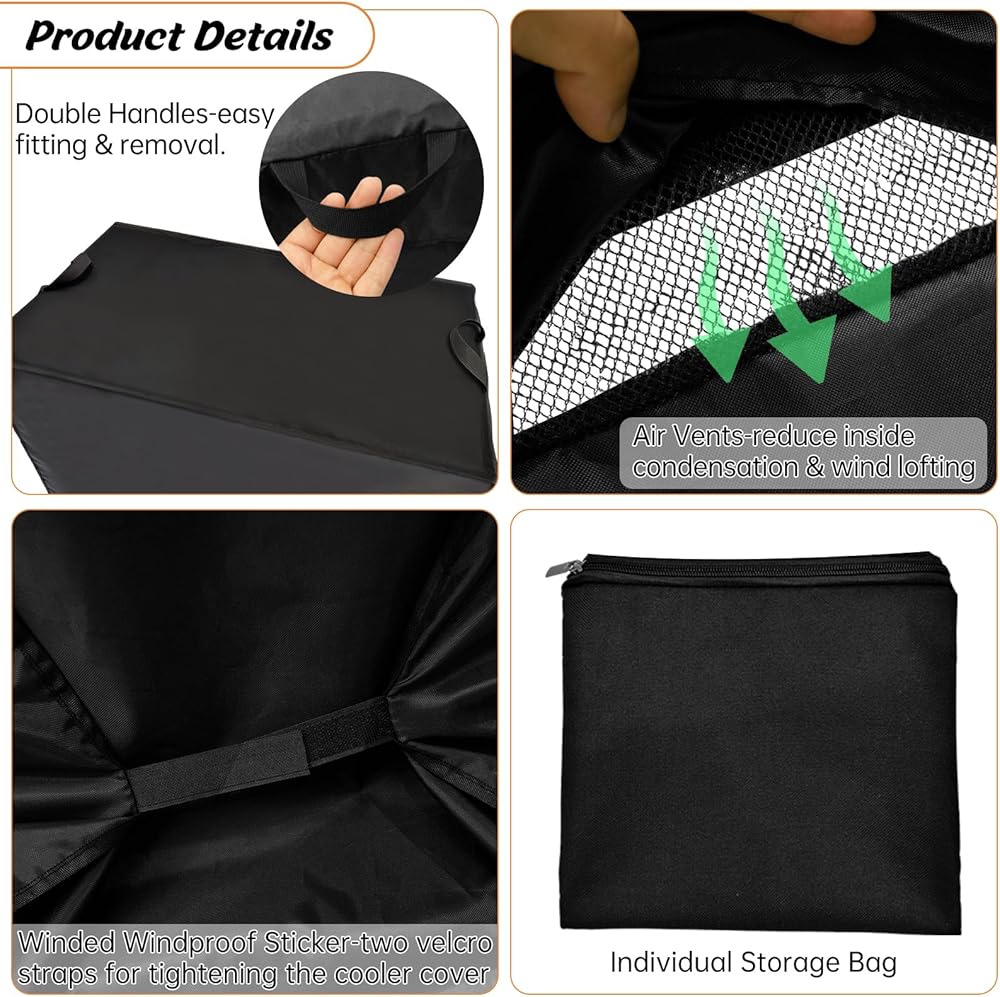 Vents and Double Handles: Air vents on both sides of the rolling ice chest cover keep the air circulating and prevent the furniture from being damaged by moisture. The double handle makes it easier for you to install/remove the cover.