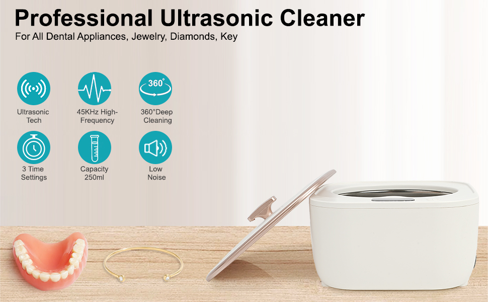 【Efficient Deep Cleaning】The ultrasonic cleaner with a frequency of 45kHz, 48,000 high-frequency vibrations per second, driving water molecules strong collision to achieve deep cleaning. The continuous impact and rupture of water effectively remove effectively removing particles from dentures, retainers, braces, teeth aligners, whitening trays, mouth guards, toothbrush heads, and even jewelry. Ultrasonic jewelry cleaner cleans forcefully and gently without damaging your valuables.