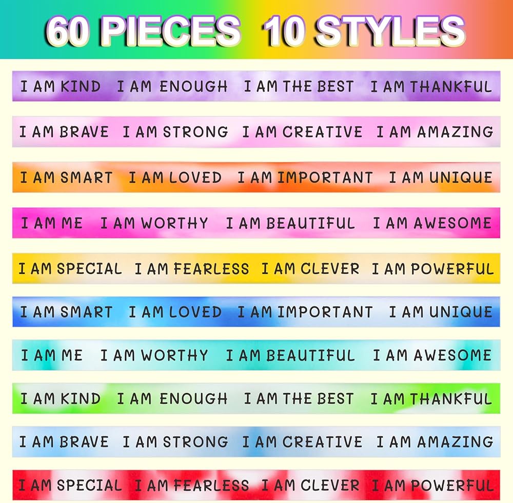 Stay Positive-Inspirational Wristband Set–You will get 60 inspirational rubber wristbands in 10 different styles, 6 of each style, a quantity enough for you to wear daily and share with your friends.