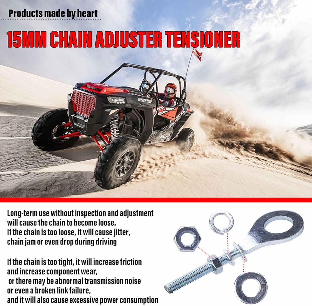 Features: Long-term use without checking and adjusting will cause the chain to be loose. The chain is too loose, which will cause shaking, chain jamming or even chain dropping during traveling. Too tight chain will increase the friction, aggravate the wear and tear of parts, or transmission noise, or even broken chain failure, and also cause excessive power consumption. It is made of high quality metal material, strong and durable, can be used for a long time.