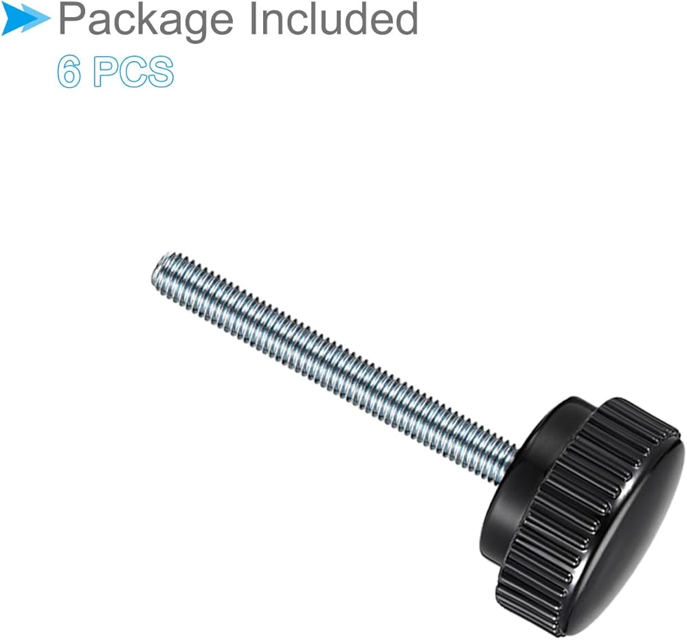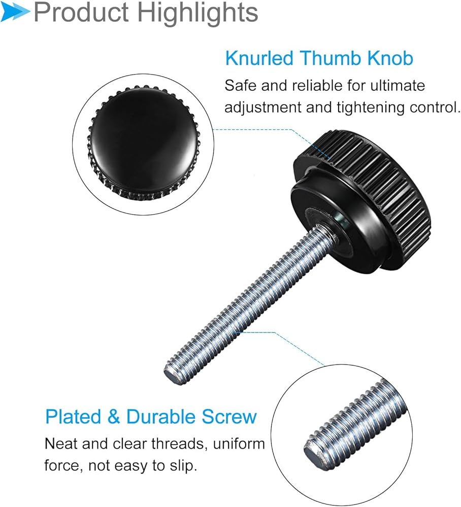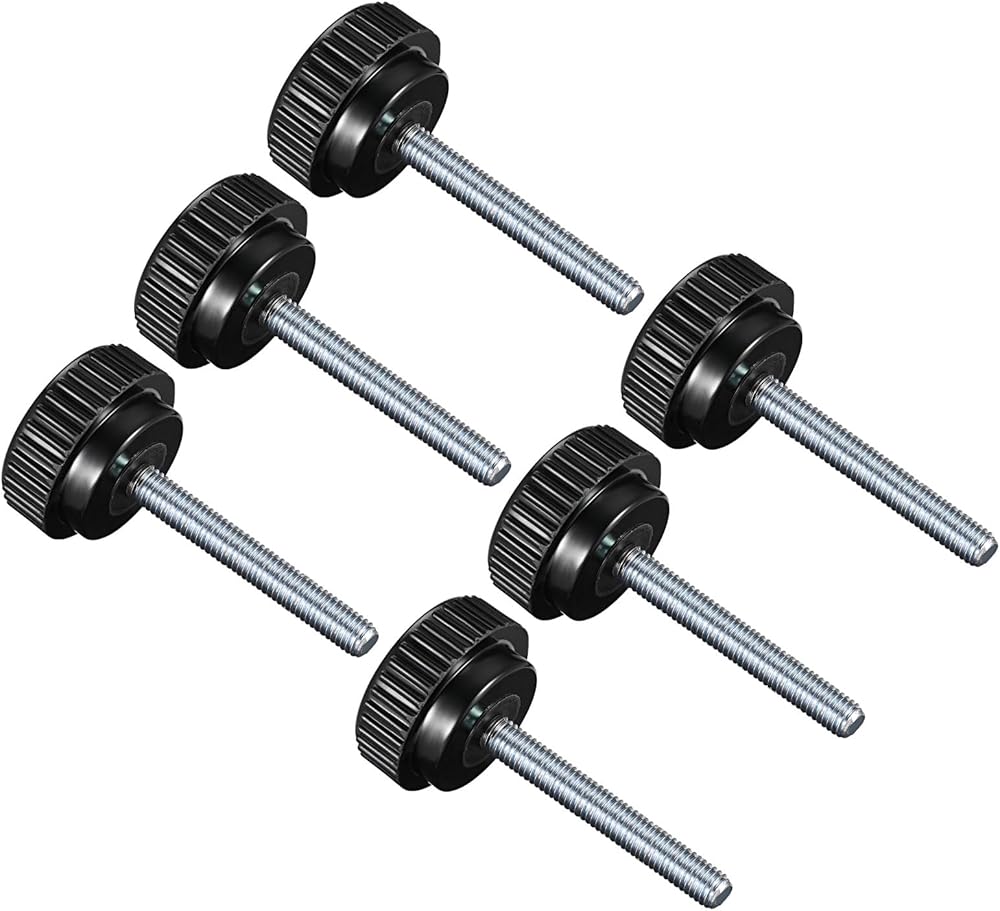 --- The knurled surface on knobs provides a non-slip grip, even with gloves or wet hands. The knurled clamping knob has a threaded stud that attaches to a mating component for quick and easy installation. Made from durable plated steel and thermoset plastic for long-lasting performance and wear resistance. The tightly-in plated steel metal insert hand screws allow adjustment without additional tools. The thumb screws provide an easy-to-use and reliable way to make optimal control for adjusting and tightening components.