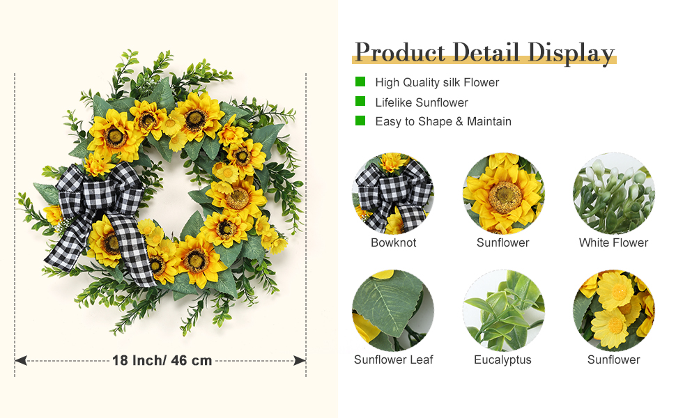 The 18 inch sunflower ring is equipped with two different styles of sunflower. It is very suitable for family door decorations in spring and summer. You can make your home full of vibrant green at any time.