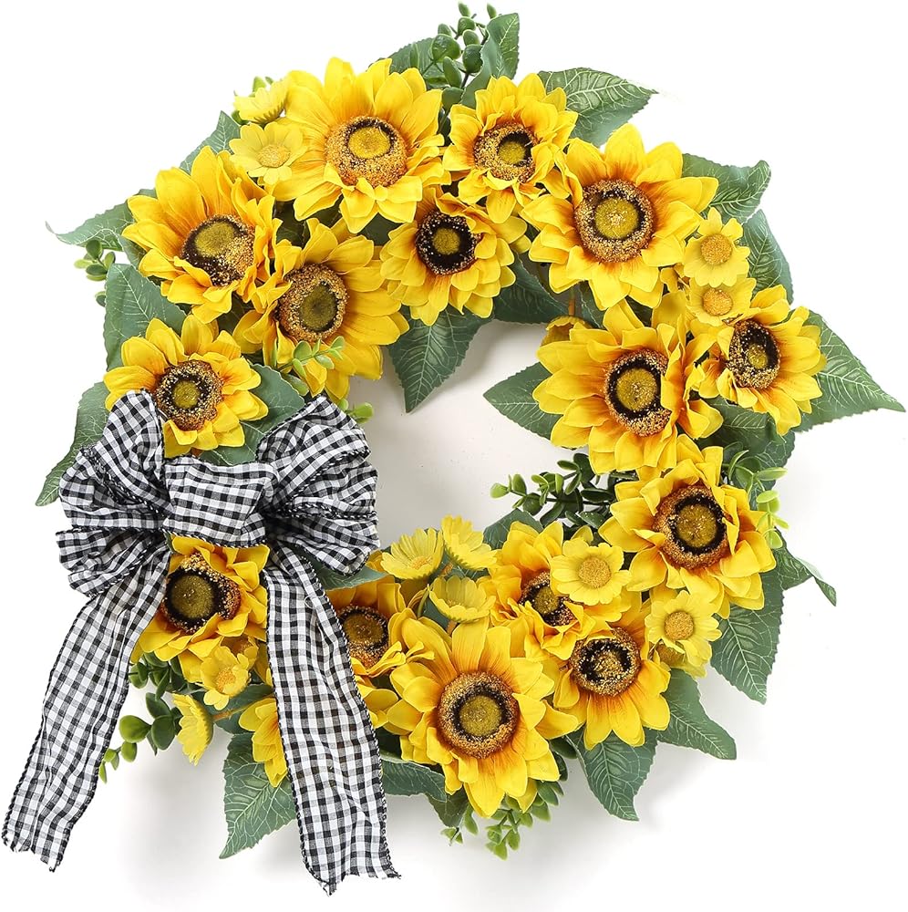 Spring Wreath for Front Door, 18In Artificial Sunflower Front Door Wreaths for All Seasons Farmhouse Wreath with Ribbon Sunflowers for Frontdoor Window Wall Home Decor