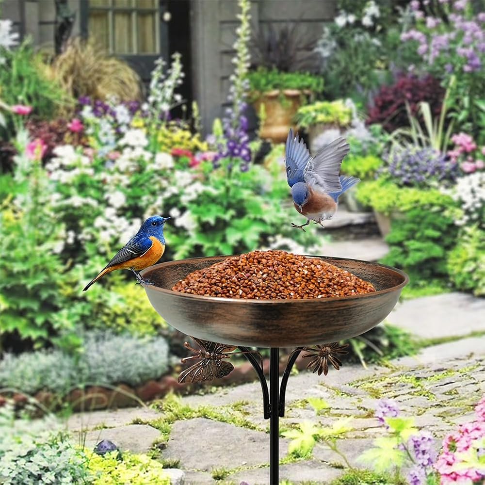 【Durable Metal Bird Bath】 Outdoor bird bath & feeder crafted with high-quality, rustproof metal, thickened bird bath bowl and pole for added strength and durability. It's eco-friendly, without pungent odours that could harm feathered friends.