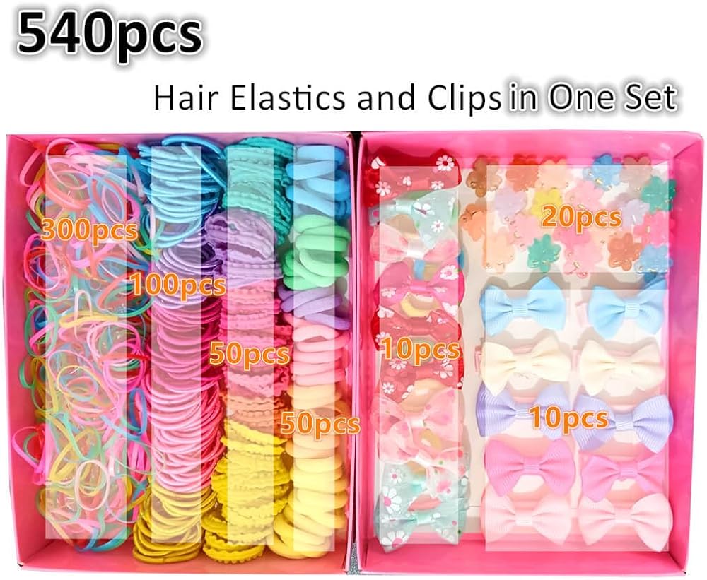 Hair tie material: elastic material and cotton Hair clips material: Plastic and metal Quantity: 540pcs in box Designed for little girls,Makes your girls stand out.
