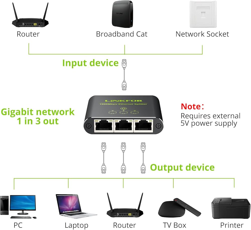 【Dual Network Connectivity】1 in 2 out allows routers or Ethernet switches to connect simultaneously to two Ethernet networks, powered by the included USB cable. It supports two computers sharing one Ethernet cable simultaneously. (Note: It requires power connection for proper operation)