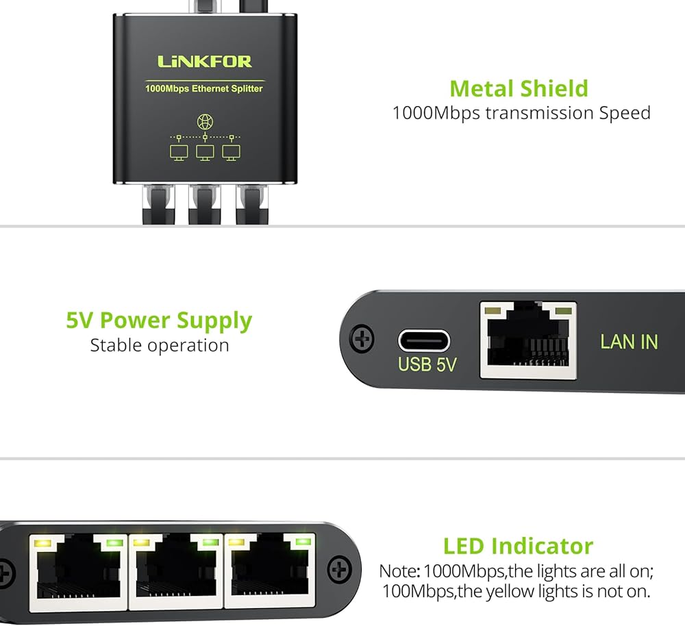 LiNKFOR Ethernet Splitter 1 in 3 Out,1000Mbps High Speed Splitter RJ45 Network Extension Connector with USB Type C Cable Gigabit Ethernet Switch Network Sharing for Cat8 Cat7 Cat6 Cat5 Cat5e