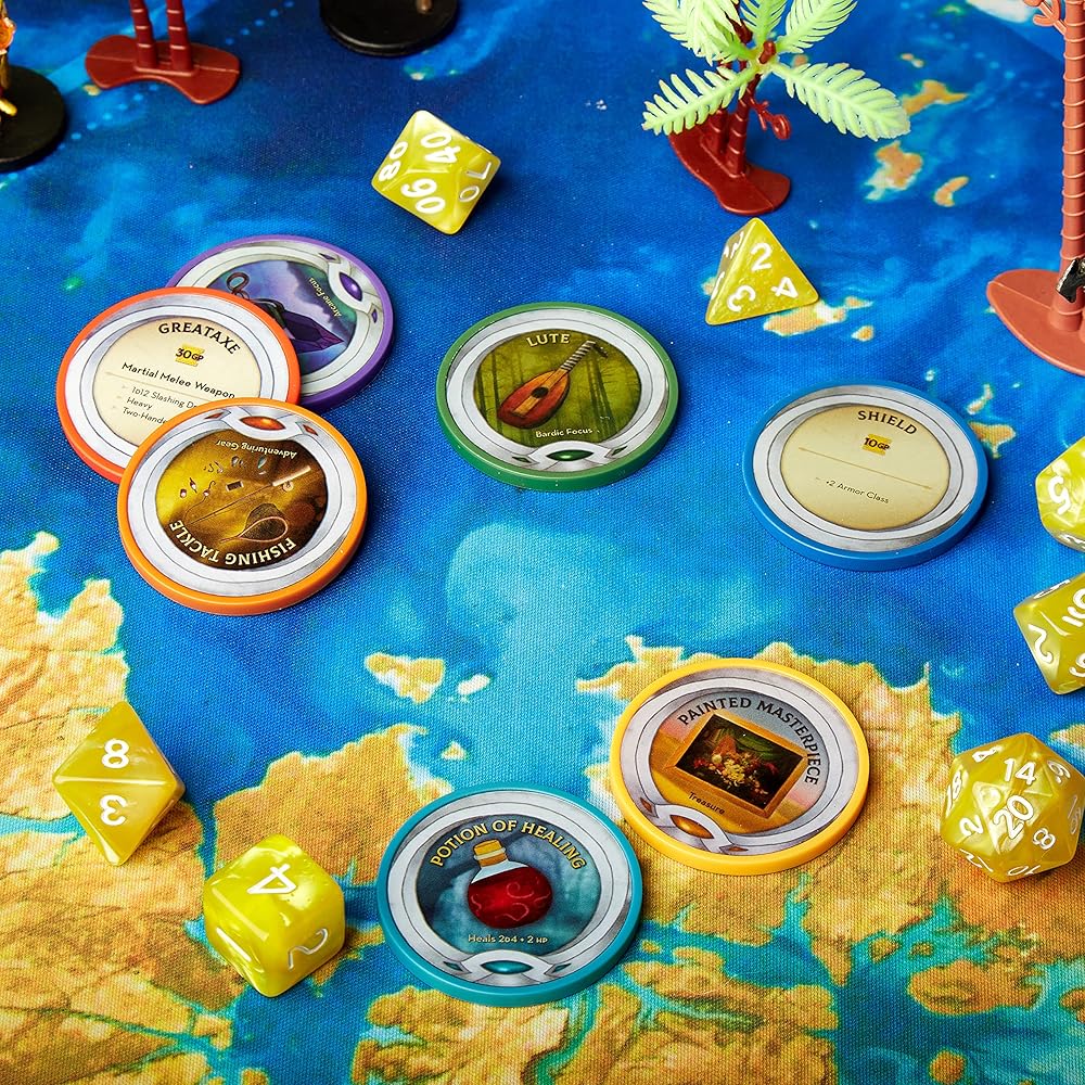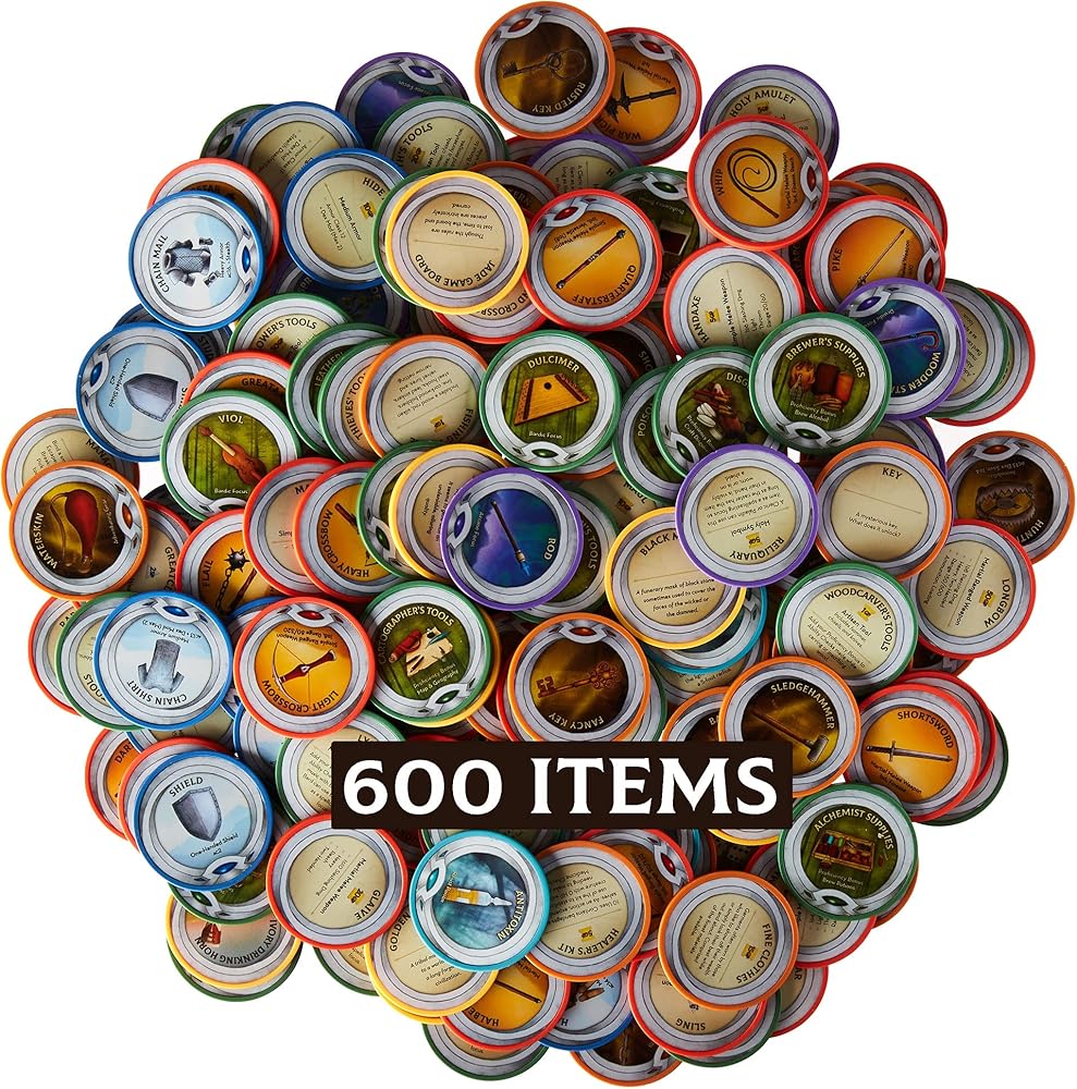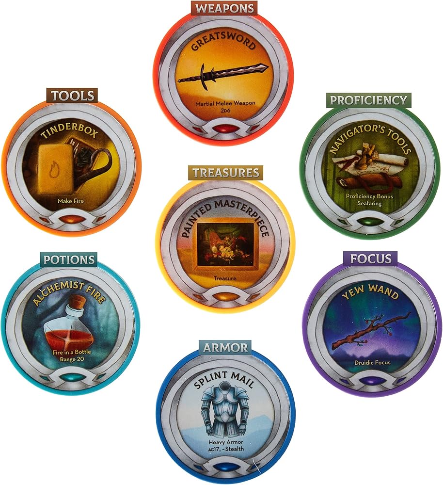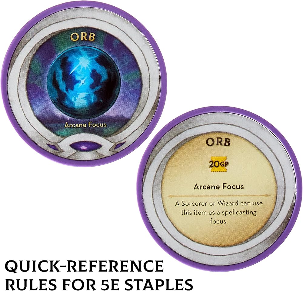 Fully-Illustrated: Includes weapons, armor, treasure, tools, magic, potions, holy & spellcasting items. Double-sided coins with quick-references on the back of each token, which is much easier to keep track of and explain to your party on the fly