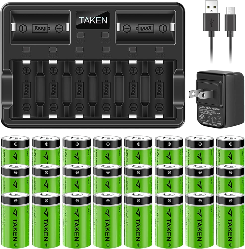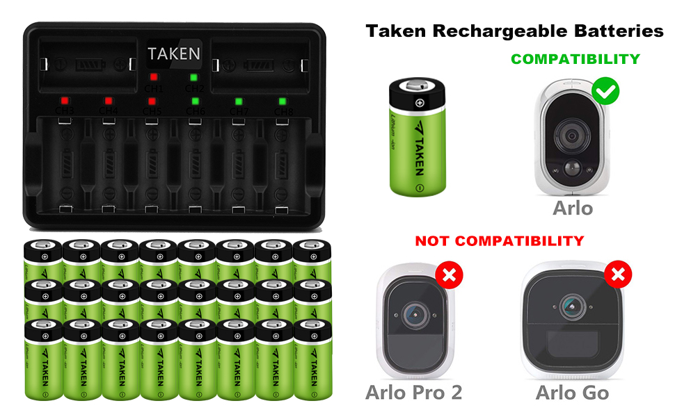 بطاريات ليثيوم CR123A من Taken لبطارية Arlo 24 Pack 3.7V 800mAh المعاد شحنها مع شاحن 8 منافذ لكاميرات Arlo (VMC3030/VMK3200/VMS3330/3430/3530)، مصباح يدوي، ميكروفون