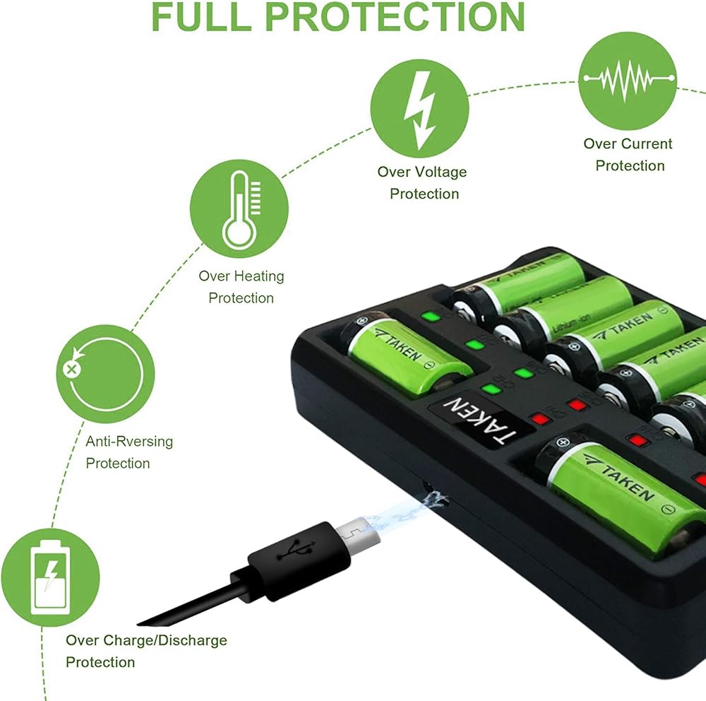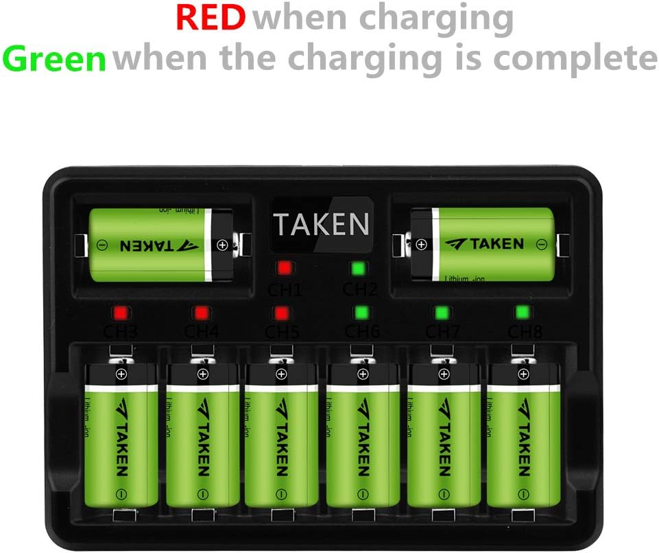 قنوات شحن مستقلة مع المؤشرات - يمكن للشاحن ذو 8 فتحات شحن 8 بطاريات في المرة الواحدة، كل واحدة من البطاريات الثماني تراقب وتشحن بشكل مستقل. يأتي شاحن البطارية مع ضوء مؤشر LED. أحمر عند الشحن وأخضر عند اكتمال الشحن.