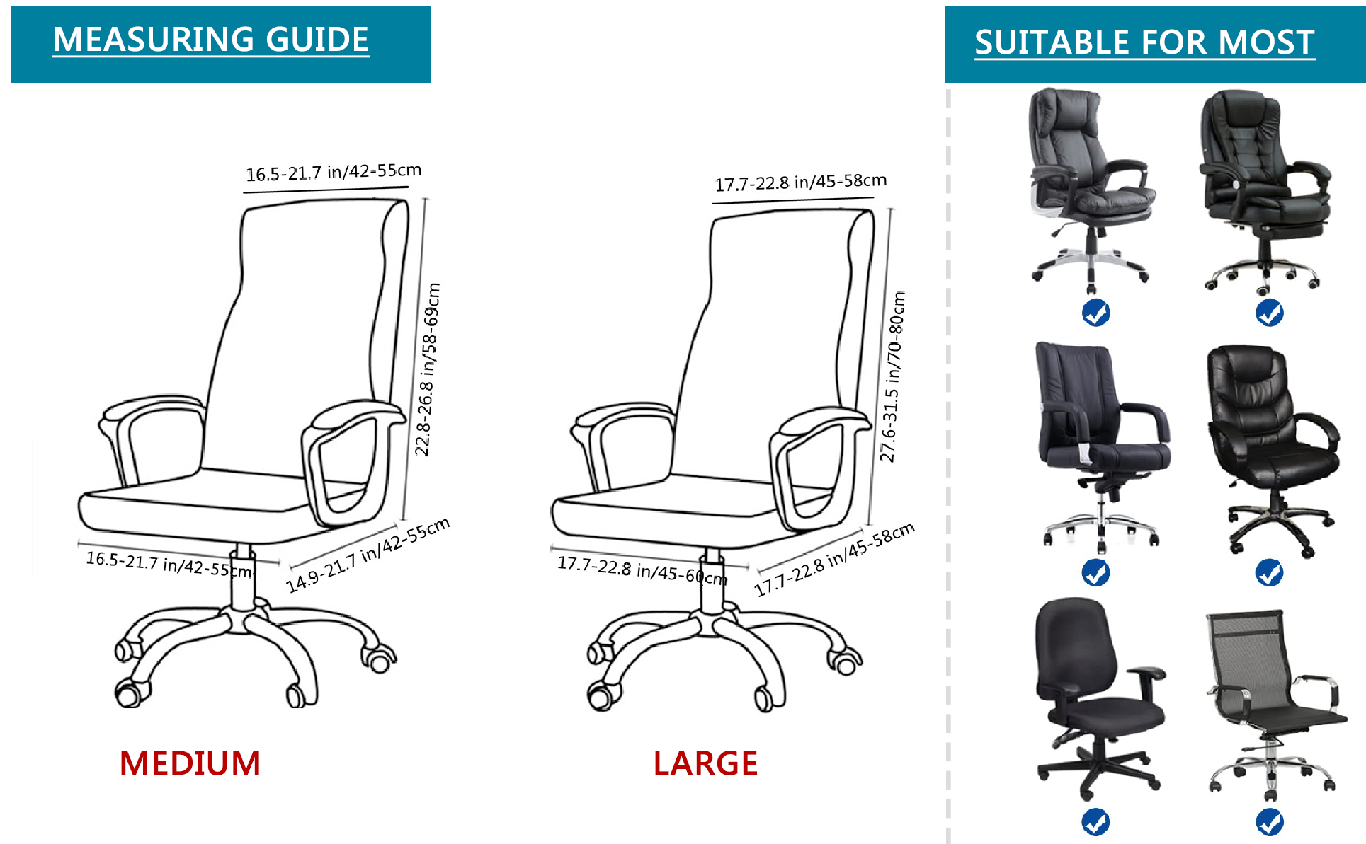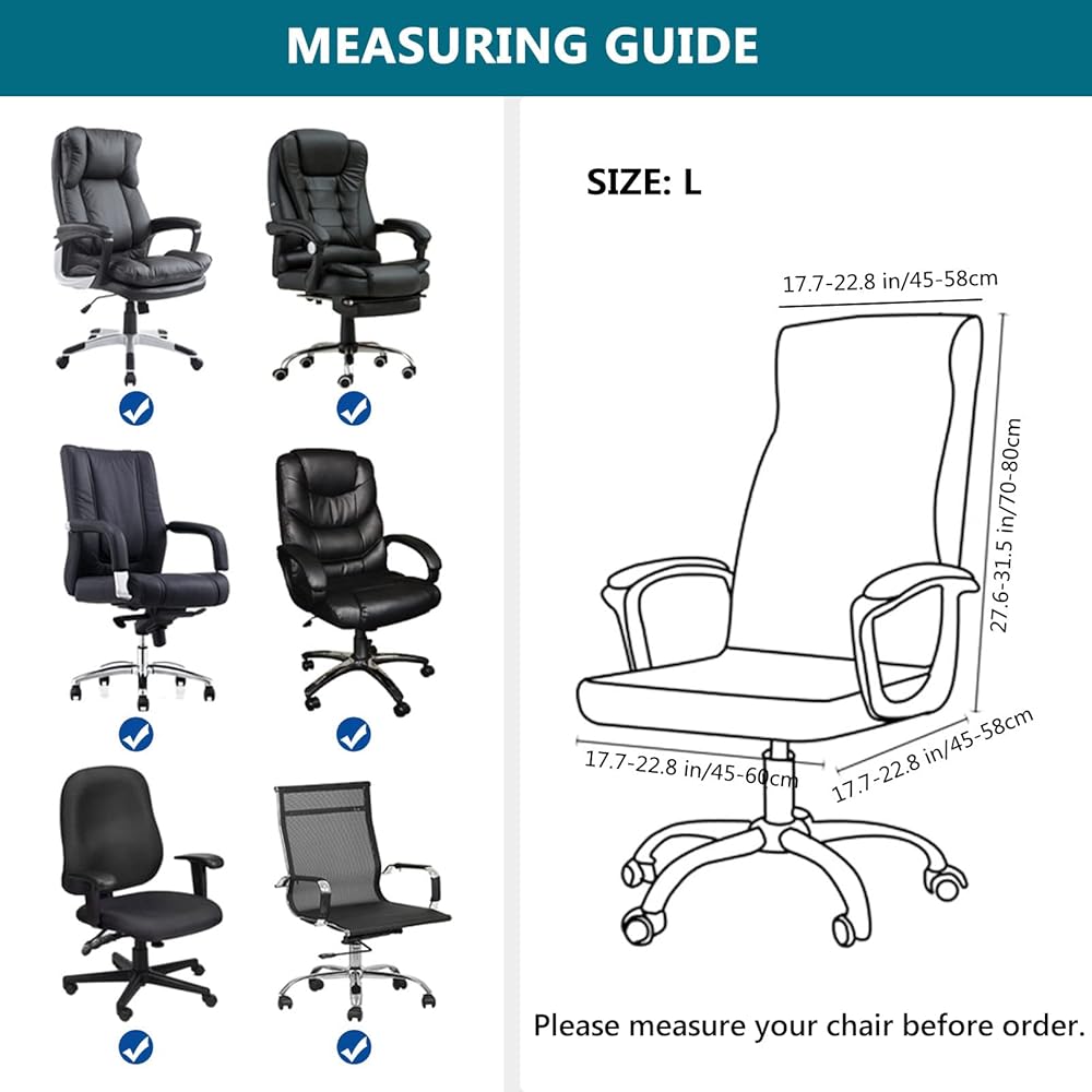 PERFECT FIT: Please measure the size of your chair before buying. [M Size]- Back Height: 22.8-26.8"; Back Width:16.5-21.7"; Back Thickness: 2.4-3.9"; Seat Length: 14.9-16.5"; Seat Width: 14.9-21.7". [Large Size]- Back Height: 27.6-31.5", Back Width: 17.7-22.8", Back Thickness: 5.1-6.6", Seat Length: 17.7-22.8", Seat Width:17.7-22.8".