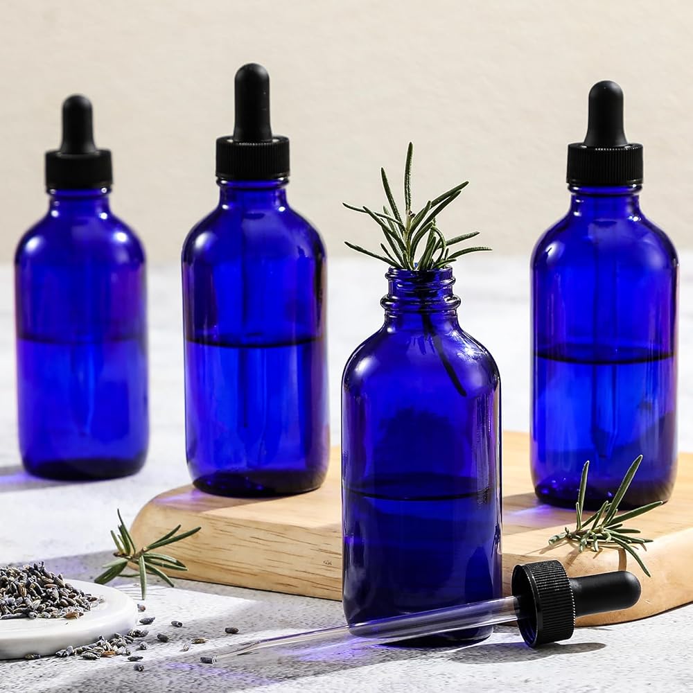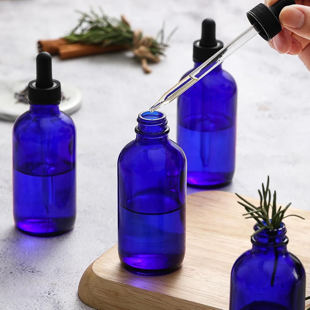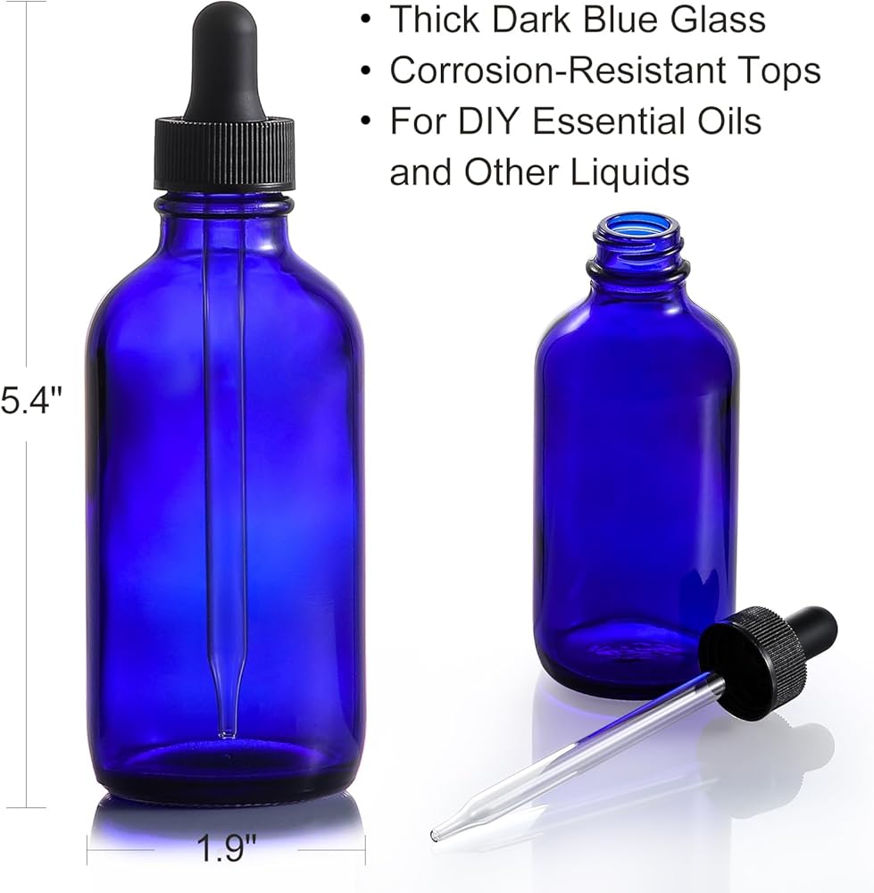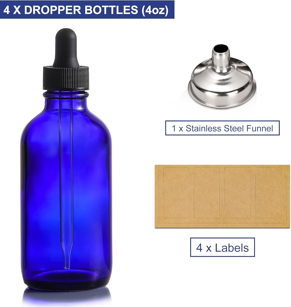 Product Includes - 4 pcs 4 OZ dark amber dropper bottles + 2pcs 1 mL calibrated glass droppers +1pcs small stainless steel funnel + 4pcs kraft paper color labels
