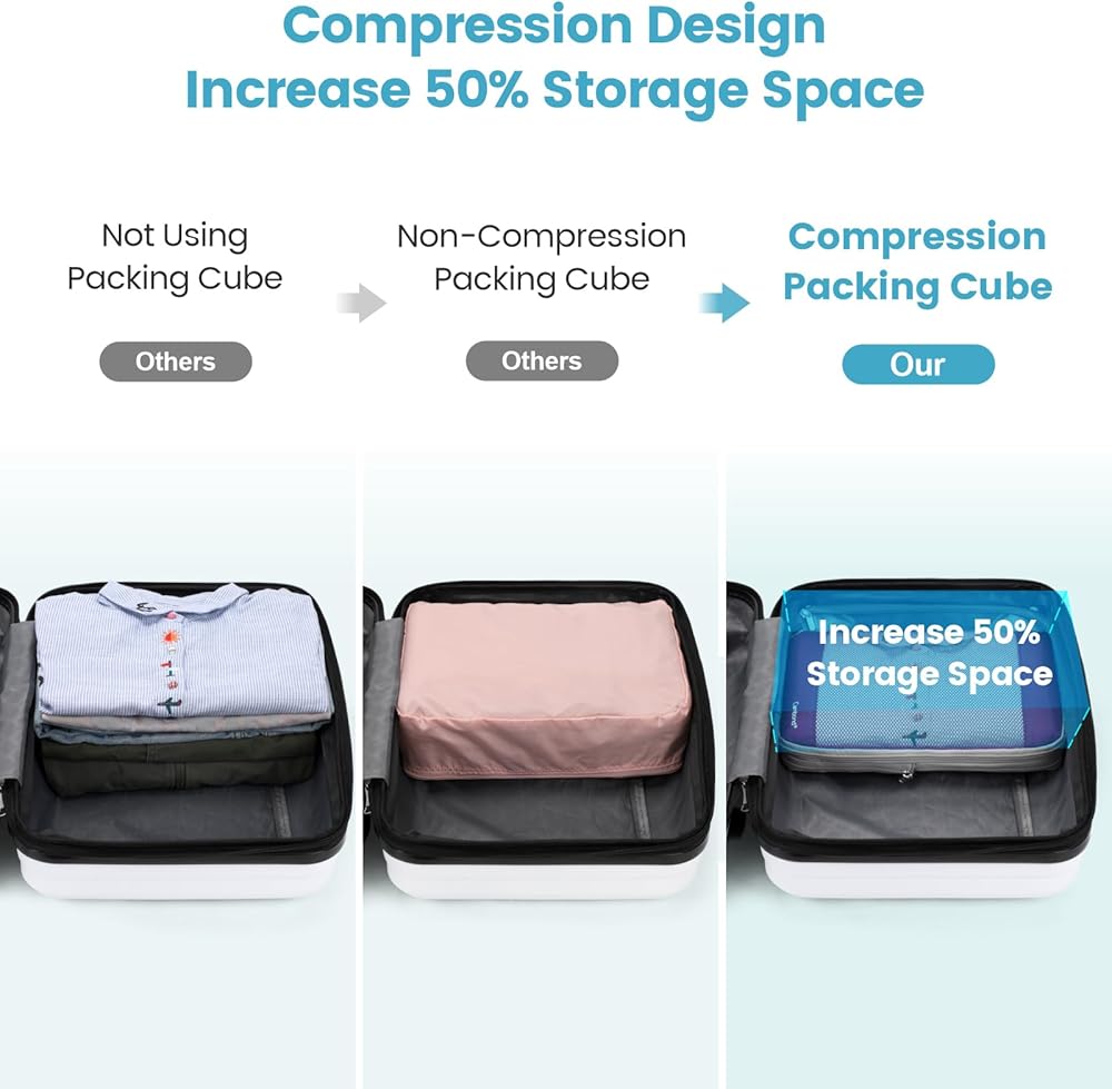 Packing More in Less Space: The packing cubes feature a compression design that helps you save up to 50% more suitcase space and allowing you to pack more. The compression zipper also keep your items secure, preventing them from moving around in your bag