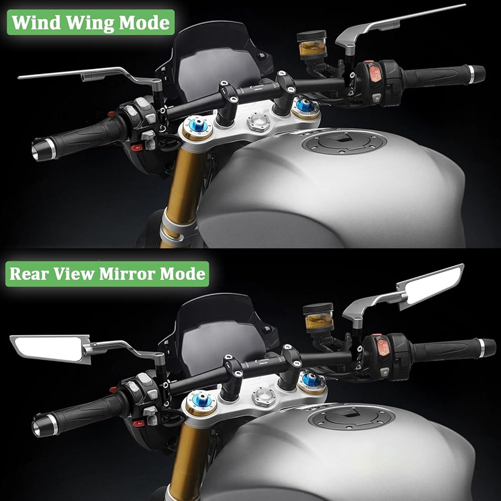 【Aerodynamic design】It's a wing when closed, and a rearview mirror when open. The aerodynamic rearview mirror enhances the appearance of the horizontal design, and its wing Angle of 25° relative to the ground gives it a linear appearance, ensuring that it generates downforce, which improves the grip and handling of the motorcycle, especially at high speeds.