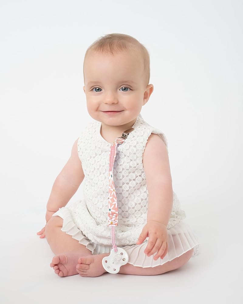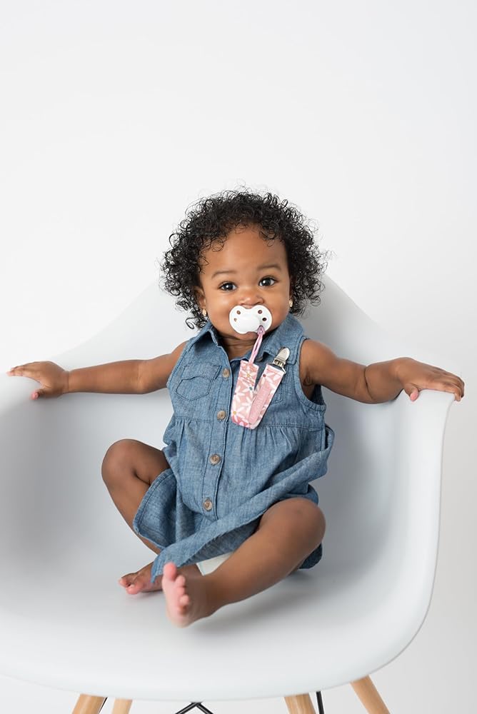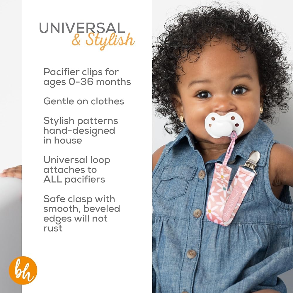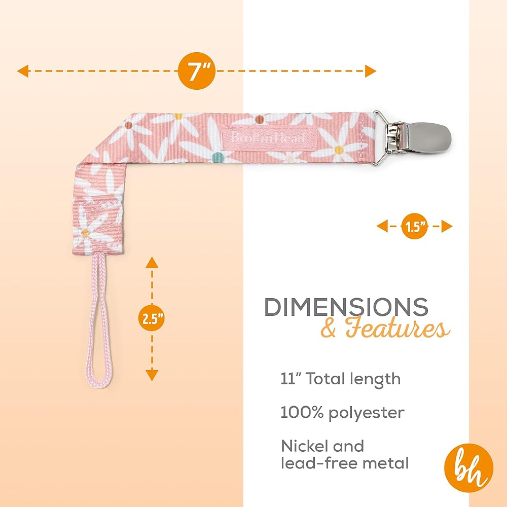 Get a grip on that pacifier! For ages 0-36 months. BooginHead Universal Pacifier Clips, Infant & Toddler Girls, Pink Daisies for infant and toddler boys and girls are stylish, universal pacifier holders compatible with ALL types of pacifiers and soothers, including small toys and teethers. Bold and classic patterns are hand-designed in house for a chic, functional piece that offers peace of mind and looks cute, too. PaciGrip's strong clasp won't pull off, yet is gentle on clothes. All babies have pacifier preference, and PaciGrip's universal attachment loop allows you to use the pacifier of your choice, integrating seamlessly into your daily life! Makes a great baby shower gift. BooginHead understands parenting is a challenge. We make it easier with stylish, universal, affordable baby products that lend a helping hand when you need it most. Happy parents. Happy babies. Joyful families.
