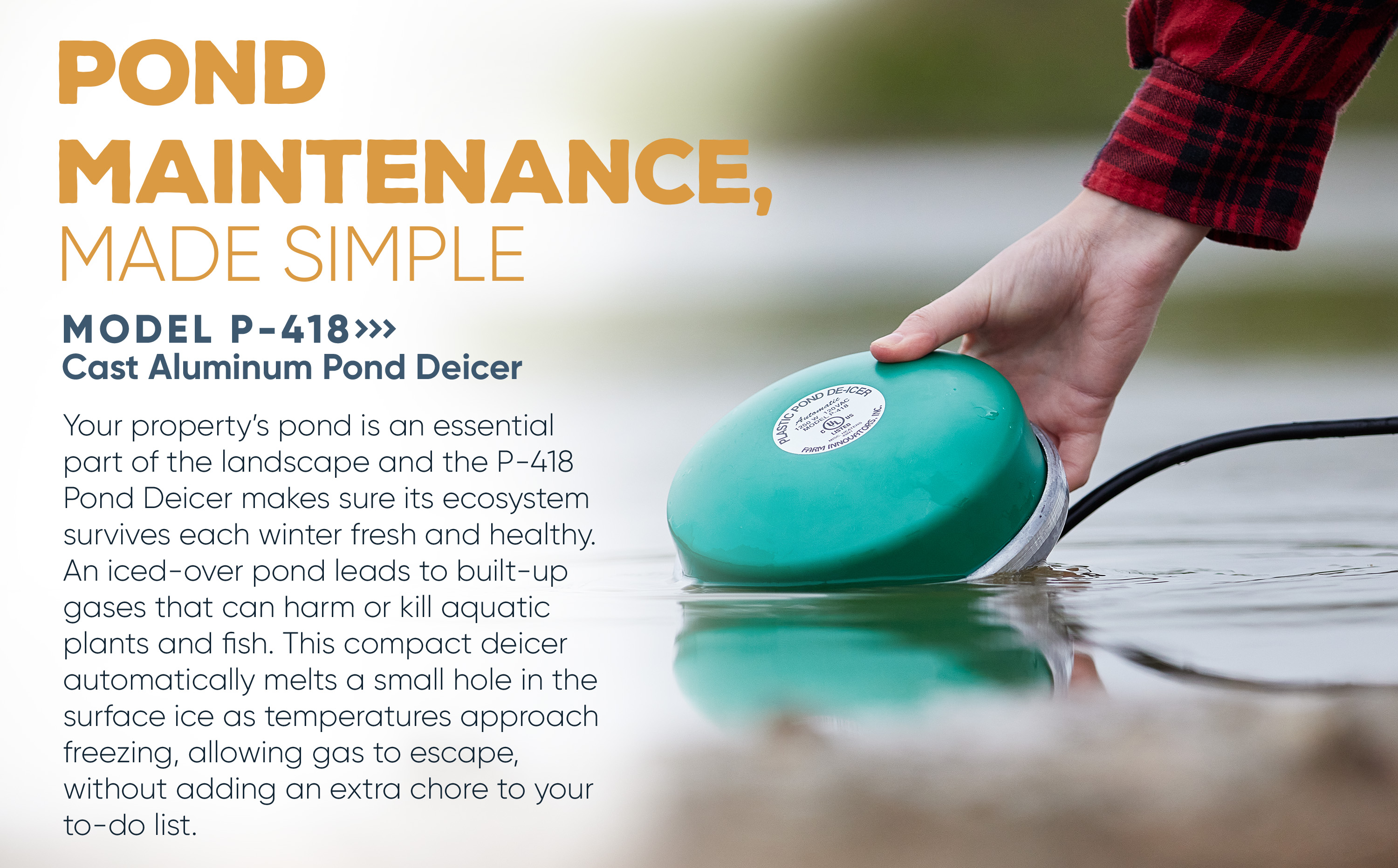 This thermostatically controlled pond de-icer maintains a vent hole in the ice to allow harmful gasses to escape. Constructed of patented cast aluminum for ultimate efficiency and safety. This fish and plant-friendly heater is for use in ponds of 50 to 600 gallons. Industry standard 10 foot supply cord..