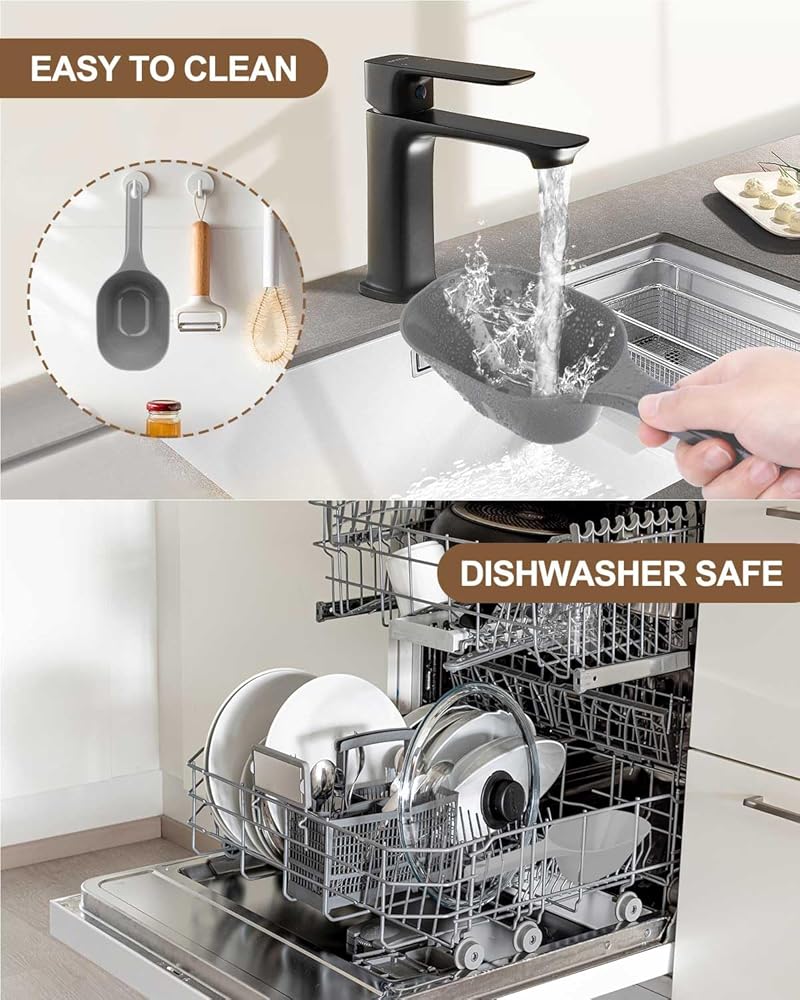 Easy to Clean and Store - Simply rinses with water and can also be washed in the dishwasher without much time and effort. There is a small hole on the handle for easy hanging.