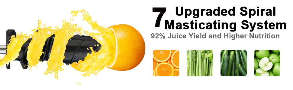 🥕【2-Speed Slow Masticating Jucier and Maximum Yield】This juicer machines is designed with flexible 2-speed control to extract various vegetables and fruits. You can squeeze soft ingredients like grapes and oranges, and hard ingredients like beetroot and celery. With 7 spiral chews, it extracts better and increases the yield of high-purity juice, retains most of the nutrients and reduces oxidation.