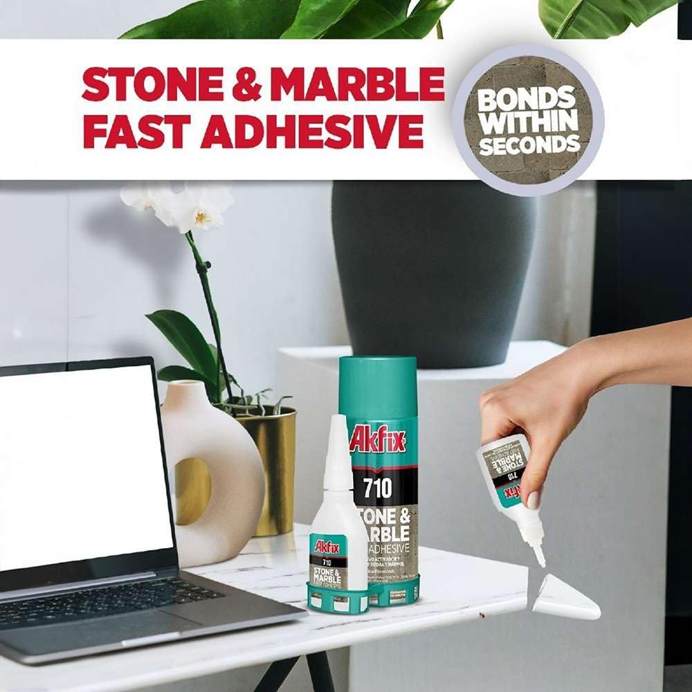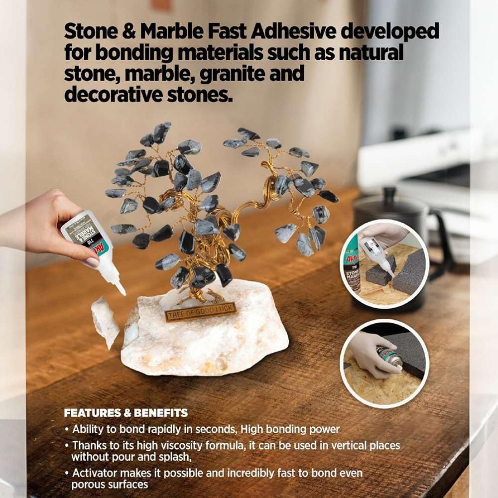 Akfix 710 Stone and Marble Fast Adhesive Kit STONEKIT is an adhesive set consisting of high viscosity cyanoacrylate and activators, which is developed for bonding materials such as natural stone, marble, granite and decorative stones. APPLICATIONS Utilized in assembly and repairs of parts such as natural stone, marble, granite, wood, MDF and metal. Preferred especially in the applications which require rapid curing. INSTRUCTIONS One of the substrates need to be smooth and have a good connection area. Apply a drop on one of the substrates and use spray on the other one. Join substrates and press firmly for approximately one minute. Application temperature is between +5°C and +35°C. Dry gel can be cleaned with Akfix DEBONDER.