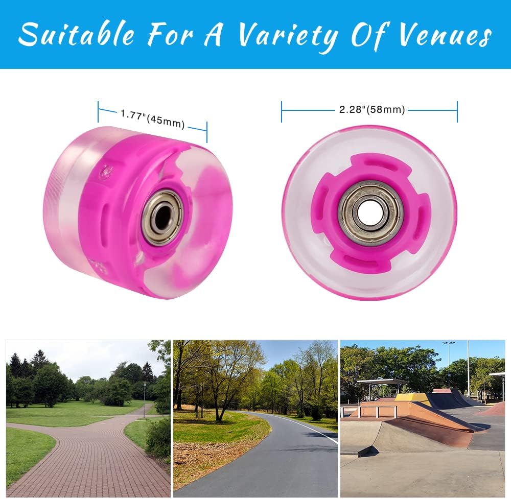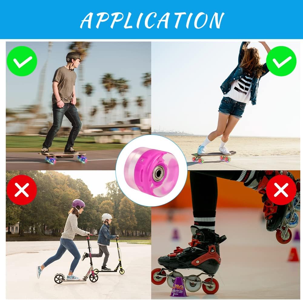 REPLACEMENT CRUISER WHEELS FOR SKATEBOARD:These wheels for cruising is not light up gimmick,they light by the magnetic core through high-speed rotation to achieve the luminous effect. They can glide over rough asphalt and brick in addition to consistent smooth speed on your everyday sidewalks.