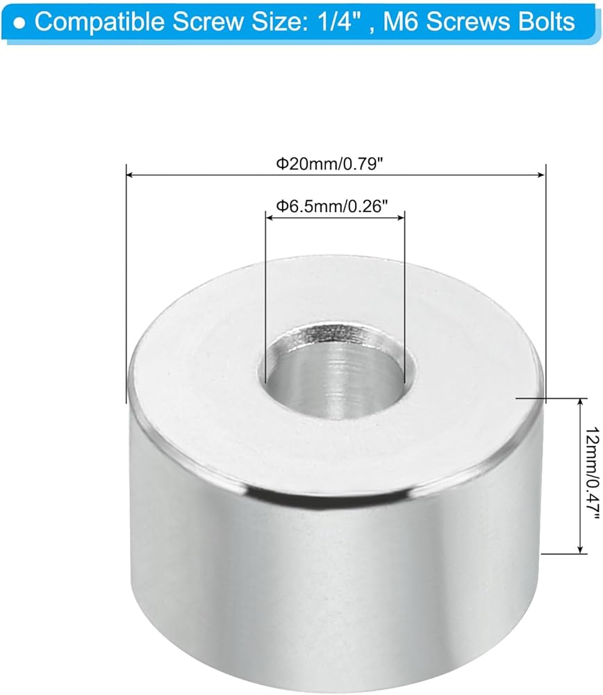 • Material: Aluminum; Color: Silver; Compatible Screw Size: 1/4" , M6 Screws Bolts; Size: 6.2mm ID x 12mm OD x 30mm