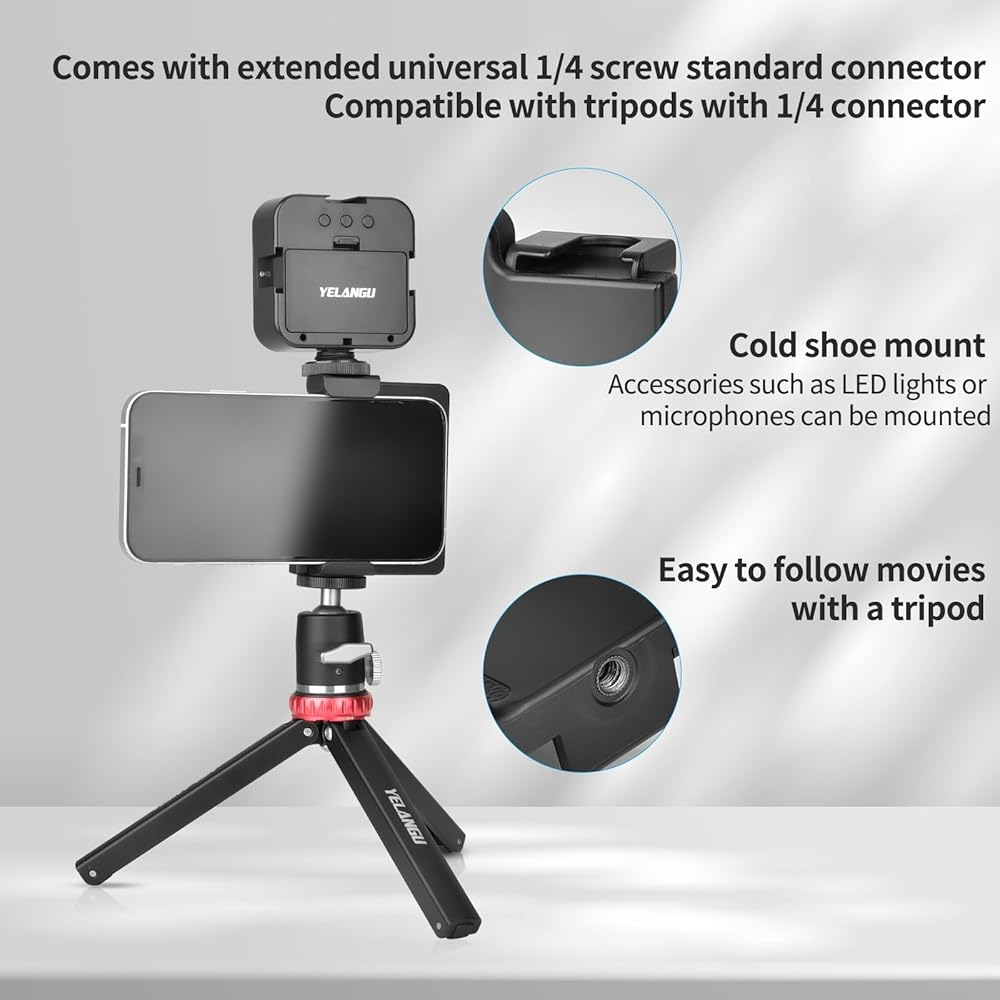Versatile Design: This YELANGU smartphone camera handle features a 1/4-inch screw mount, making it compatible with all tripod stands that have a 1/4-inch screw interface, allowing you to easily connect your shooting equipment. Additionally, it also includes a cold shoe interface and a 1/4-inch-20 internal thread design for easy installation of LED lights or microphones, catering to your various shooting needs.